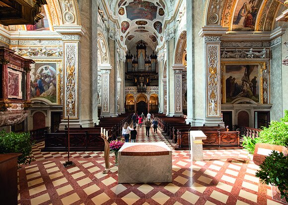 Die Führung zeigt unter anderem das beeindruckende Fresko Daniel Grans im Marmorsaal, welches die Glorie des Hauses Österreich erzählt, sowie die privaten Appartements Karls VI.