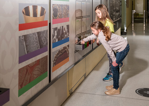Interaktive Erlebnisstation in unmittelbarer Nähe der Sala terrena/Besucherempfang, am Gang zur Schatzkammer; ganzjährig während der Öffnungszeiten zugänglich in Verbindung mit einem Eintrittsticket. Der „Materialitätensekretär“ dient als praktische Vertiefungsebene zu den kostbaren Artefakten in der Schatzkammer.