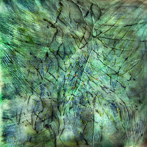 Das Erste, was ins Blickfeld stößt, nachdem die Haupt- (und Lieblingsfarbe) Grün als solche identifiziert ist, sind im Kontrast zur zarten Farbe die schwarzen Linien, welche sich wirr über die gesamte Fläche mal mehr, mal weniger zielstrebig in die Wege zu leiten scheinen. Mal bilden diese Linien deutlich hervorgehobene Gestalten, mal sind diese Gestalten auch nur angedeutet, bevor sie dann in der Dimension längst vergangener Erinnerungen zu entweichen scheinen. Hin und wieder zeigen sich auch einzelne Erinnerungsfetzen in Form von kleinen Punkten oder einfachen, farblichen Merkmalen, die ihre einzigartige, vielfältige Form erst unter dem Mikroskop zeigen können.