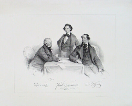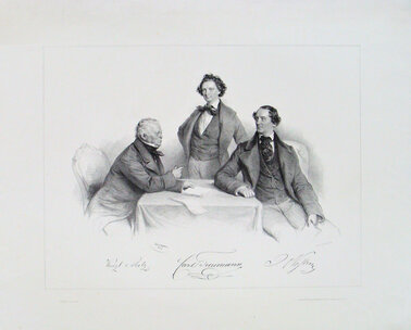 Das von Josef Kriehuber 1855 lithographierte Gruppenporträt, zeigt an den Seiten eines Tisches sitzend, links den Schauspieler Wenzel Scholz (1787-1857) und rechts den Dichter Johann Nestroy (1801-1862). In der Mitte stehend ist Matthias Karl Ludwig Treumann (1823-1877) porträtiert. Die Graphik zeigt sie als gutsituierte Persönlichkeiten, gekleidet in der Mode ihrer Zeit, bestehend aus weißem Hemd mit seidig glänzenden Plastrons, Weste und Uhrenketten sowie einem Gehrock. Jeder der drei Herren kann auch als Einzelporträt lithographiert worden sein und wurde in dieser Graphik als Gruppenporträt zusammengesetzt. Der Innenraum wurde durch den Tisch, auf dem sonst leeren Blatt, evoziert.