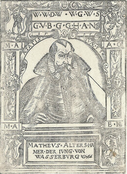 Dieses Porträt aus dem späten 16. Jahrhundert von Mattheus Altershamer dem Jüngeren (DER IVNG) im Alter von 53 Jahren gehört zu dieser Tradition. Das Wappen der Altershamer zeigt auf schwarzem Grund im Silber einen völlig geharnischten Mann mit Vollbart, auf einem Dreiberg nach links schreitend. [1] Der kleine Schatten unter der Hand des Porträtierten zeugt von den künstlerischen Kenntnissen des unbekannten Autors dieses Porträts. Es ist möglich, dieses Blatt mit anderen ähnlichen Porträts zu vergleichen, um sich ein Bild von der durchschnittlichen Reichhaltigkeit dieser Stiche und der individuellen Variation der Dekore zu machen.