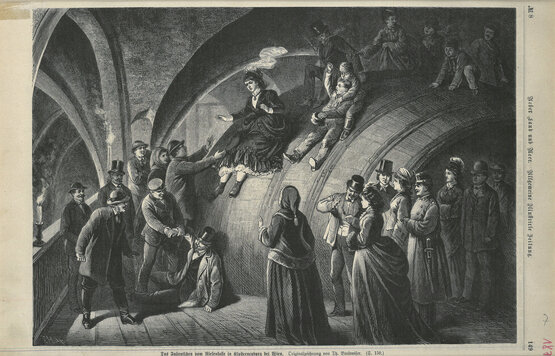 Gezeigt ist hier eine Seite aus der deutschen Zeitschrift Über Land und Meer, Band 35, Jahrgang 18, von 1876. [3] Sie stellt auf amüsante und dynamische Weise den lokalen Brauch des „Faßlrutschens“ im Keller von Klosterneuburg am Tag des Leopoldi-Festes dar. [4]