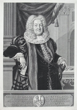 Die Inschrift am unteren Rand des Blattes verrät, wer hier dargestellt ist. Es handelt sich um ein Porträt des deutschen Adeligen Georg Burkhard Löffelholz von Colberg (1664 - 1737), der dem Nürnberger Patriziat angehörte. Als Waldamtmann und später Ratsherr war er eine namhafte Persönlichkeit. Das hochformatige Kniestück reiht sich in die Tradition der Porträtstiche der Nürnberger Patrizier des 17. und 18. Jahrhunderts ein.