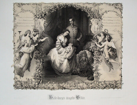 Auf der Lithografie „Habsburgs jüngste Blüte“ begegnet uns der kitschig verklärte und zugleich repräsentative Anblick einer der bekanntesten Kaiserfamilien Österreichs: Kaiserin Elisabeth (1837-1898) hat ihren Blick liebevoll auf die erstgeborene Tochter Erzherzogin Sophie Friederike (1855-1857) in ihrem Schoß gesenkt, der Arm des neben ihr stehenden Ehemannes Kaiser Franz Joseph I. (1830-1916) ist sanft um ihre Schulter gelegt. [1]
