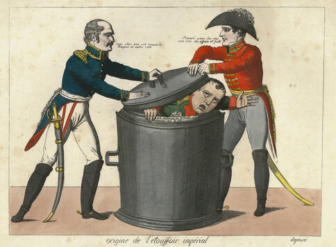 Links sehen wir den preußischen General Blücher und rechts den Briten Wellington, die Napoleon in eine große Mülltonne drücken. Blücher sagt: „Mein lieber Freund, dieser Mann kommt bei Ihnen wieder zu Atem.“ Worauf Wellington antwortet: „Verlassen Sie sich auf mich, mein Freund!“ Napoleon schreit: „Meine Herren, ersticken Sie mich nicht! Rettet mir das Leben!“ Beiden gelingt es gemeinsam Napoleon endgültig im Mistkübel der Geschichte zu entsorgen.