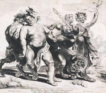 Geschaffen wurde die Druckgrafik nach einem heute verlorenen Ölgemälde von Peter Paul Rubens. Diesem Bild soll einem anderen Bild aus dem Œuvre Rubens nahekommen. Das Werk „Bacchus“ (St. Petersburg, Eremitage), welches zwischen 1638 und 1640 gemalt wurde, zeigt zwar einen ähnlichen Bildaufbau, wie auch das gleiche Bildpersonal, lässt aber Unterschiede an deren Anordnung erkennen. Beigefügt ist eine Kopie dieses Werkes, die heute im Nationalmuseum Stockholm zu finden ist.