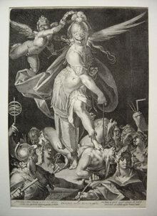 In Sadelers Stich erkennen wir aber nicht bloß seine künstlerische Eigenleistung und außerordentliche handwerkliche Fähigkeit, sondern auch sein Gespür für die Ansprüche des Kunstmarktes. Er war selbst der Verleger seiner Werke und kannte daher die Ansprüche und Vorlieben des Publikums genau. [6] Indem er die Bildstruktur vereinfachte und Provokationen wie Minervas entblößte Brust verdeckte, machte er seine Werke einem breiteren Publikum zugänglich.