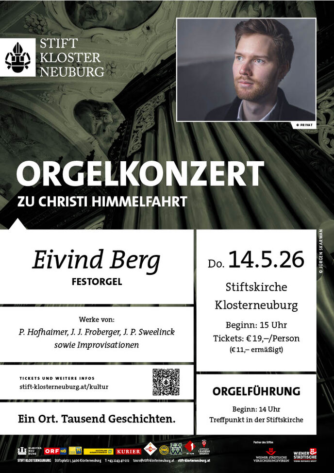 14.05.2026Sucht man einen hervorragenden Organisten, Improvisator, Korrepetitor, Continuo-Spieler und noch dazu eine zuvorkommende Persönlichkeit, ist man bei Eivind Berg genau richtig. Seine diversen Einsatzmöglichkeiten hat der gebürtige Norweger bei uns im Stift bereits mehrmals bravourös präsentiert. Seine Vielseitigkeit wird er auch bei seinem Konzert an der Festorgel ausspielen, wo er mit der Freundt-Orgel eine „alte Bekannte“ wiedertrifft. Neben seiner kirchenmusikalischen Tätigkeit in verschiedenen Kirchen Wiens und Umgebung unterrichtet er unter anderem an der Universität für Musik und darstellende Kunst Wien und ist ein international gefragter Konzertorganist und Continuo-Spieler.