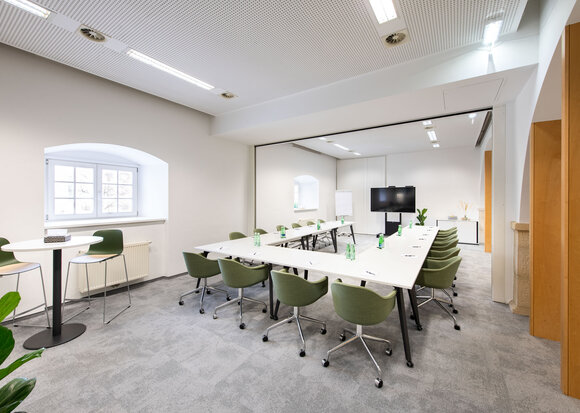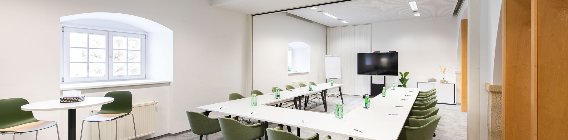 | U-Form für max. 12 Personen plus zusätzlicher kleiner Blocktafel für 8 Personen |