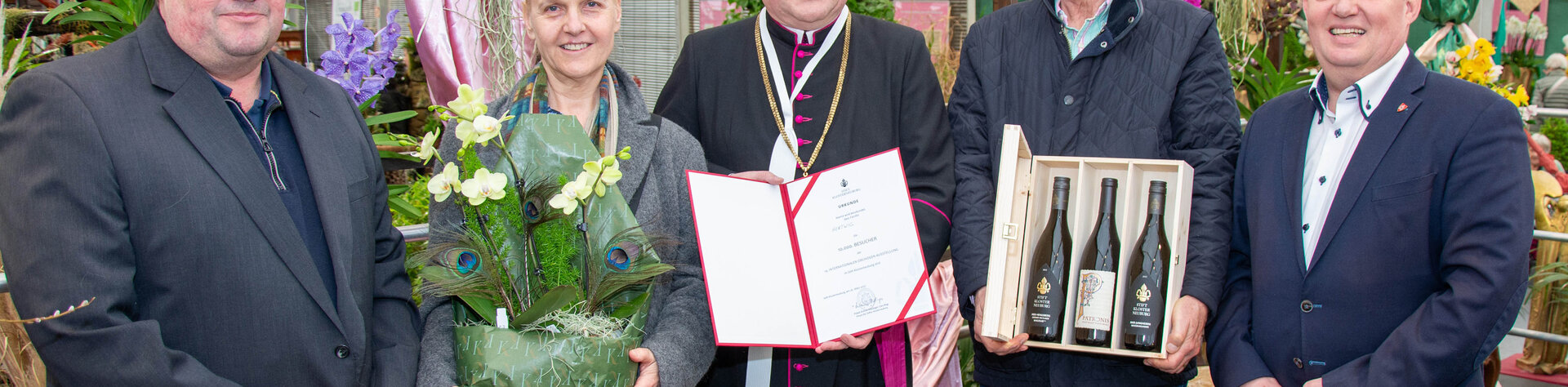 Foto v.l.n.r.: Leiter der Gärtnerei des Stiftes Klosterneuburg Josef Bauer jun., Brigitte Hertwig, Propst Anton Höslinger Can.Reg., Alexander Hertwig und Stadtrat Leopold Spitzbart bei der Überreichung der neu gezüchteten Orchidee „Kristina Sprenger“, einen 3er Karton erlesener Weine des stiftlichen Weingutes und einer Urkunde als offizielle Bestätigung als 10.000ste Besucher.