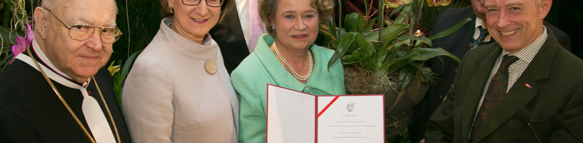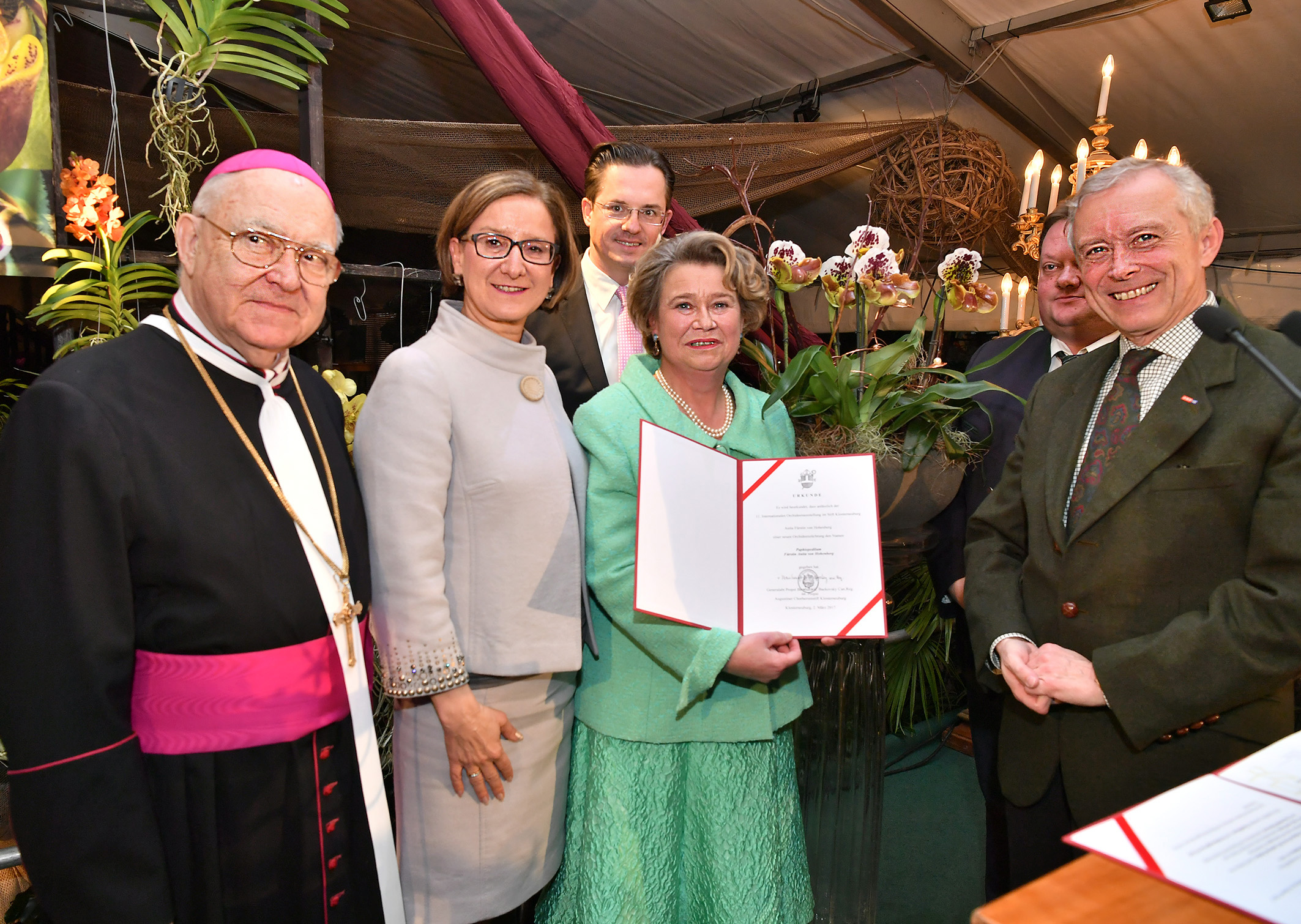 11. Internationale Orchideen-Ausstellung mit Orchideen-Patin, Fürstin Anita von Hohenberg. Im Bild von li. nach re.: Generalabt Propst Bernhard Backovsky, NÖ Landeshauptmann Stv. Mag. Johanna Mikl-Leitner; Klosterneuburger Bürgermeister Mag. Stefan Schmuckenschlager; Fürstin Anita von Hohenberg, Landesdirektor ORF NÖ Prof. Norbert Gollinger