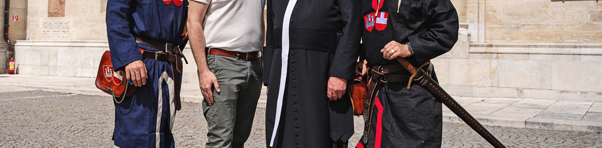 Mittelalterfest-2025 © Victor Liska: Stift und Stadt feierten (v.l.): Matthias Hofmeister-Kiss, Kulturleiter Stift Klosterneuburg, Bürgermeister Christoph Kaufmann, Stiftsdechant Clemens Galban, Can.Reg., Alexander Lung, Leiter des Marktamtes der Stadt Klosterneuburg.