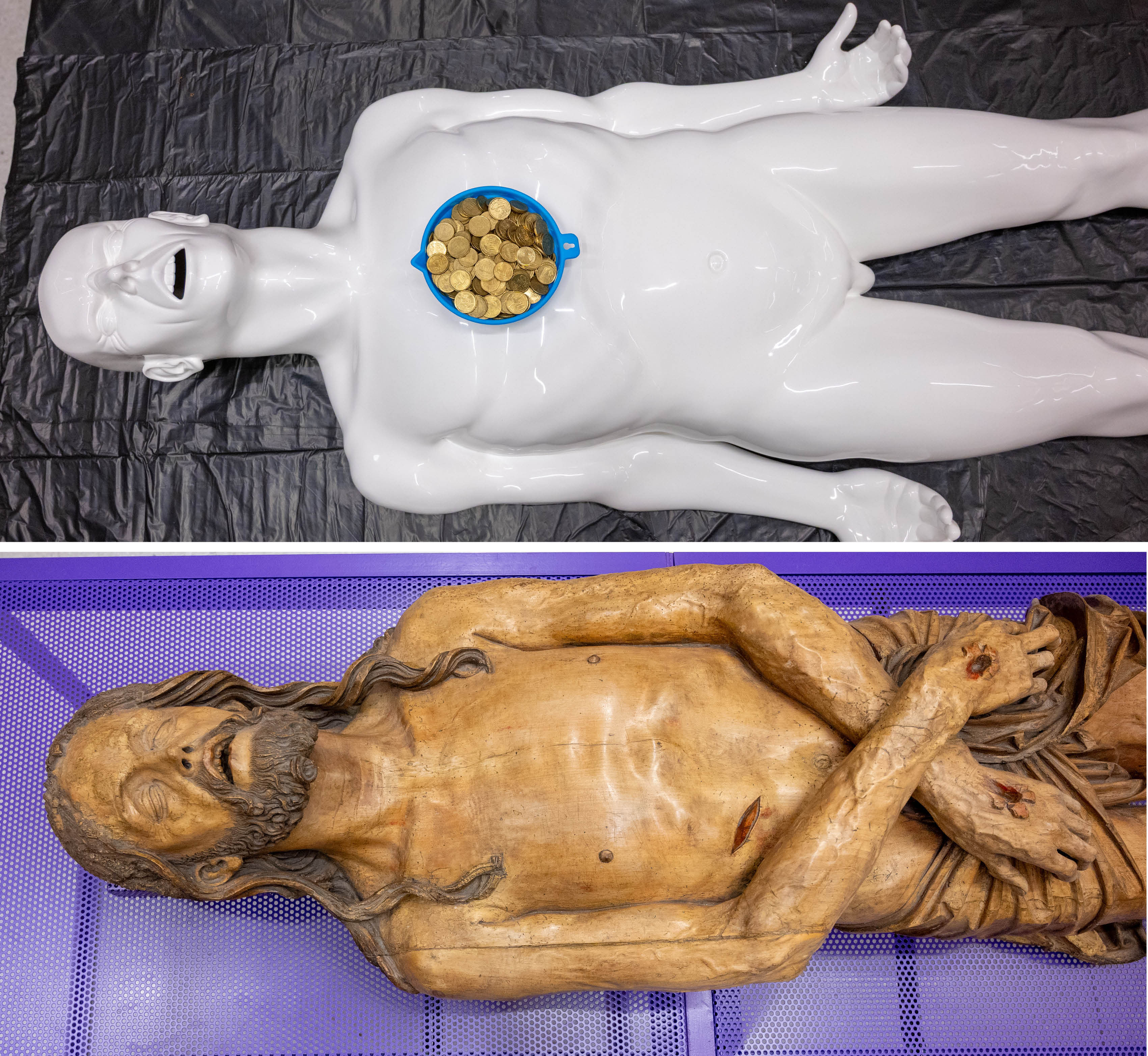 In der Ausstellung „Gott und Geld“ stellt sie Wolfgang Christian Huber, Kurator und Stiftskustos, einander gegenüber und setzt sie zueinander in Beziehung. Wie beispielsweise die Skulptur „So wie du dich bettest, so schläfst du“ von Urban Grünfelder. Sie weist erstaunliche formale Parallelen zum Klosterneuburger Grabchristus von 1498 auf. Neben Grünfelders Skulptur sind auch alle anderen Werke der Finalist:innen und Gewinner:innen des St. Leopold Friedenspreises, in die Ausstellung integriert. Mit dem Kunstpreis werden Werke ausgezeichnet, die sich kritisch mit humanen und gesellschaftspolitischen Themen auseinandersetzen. Heuer lautete das Motto „Sogar den Abfall machen sie zu Geld“.