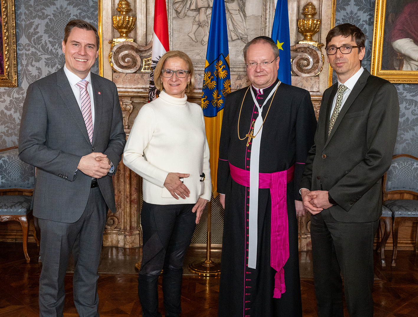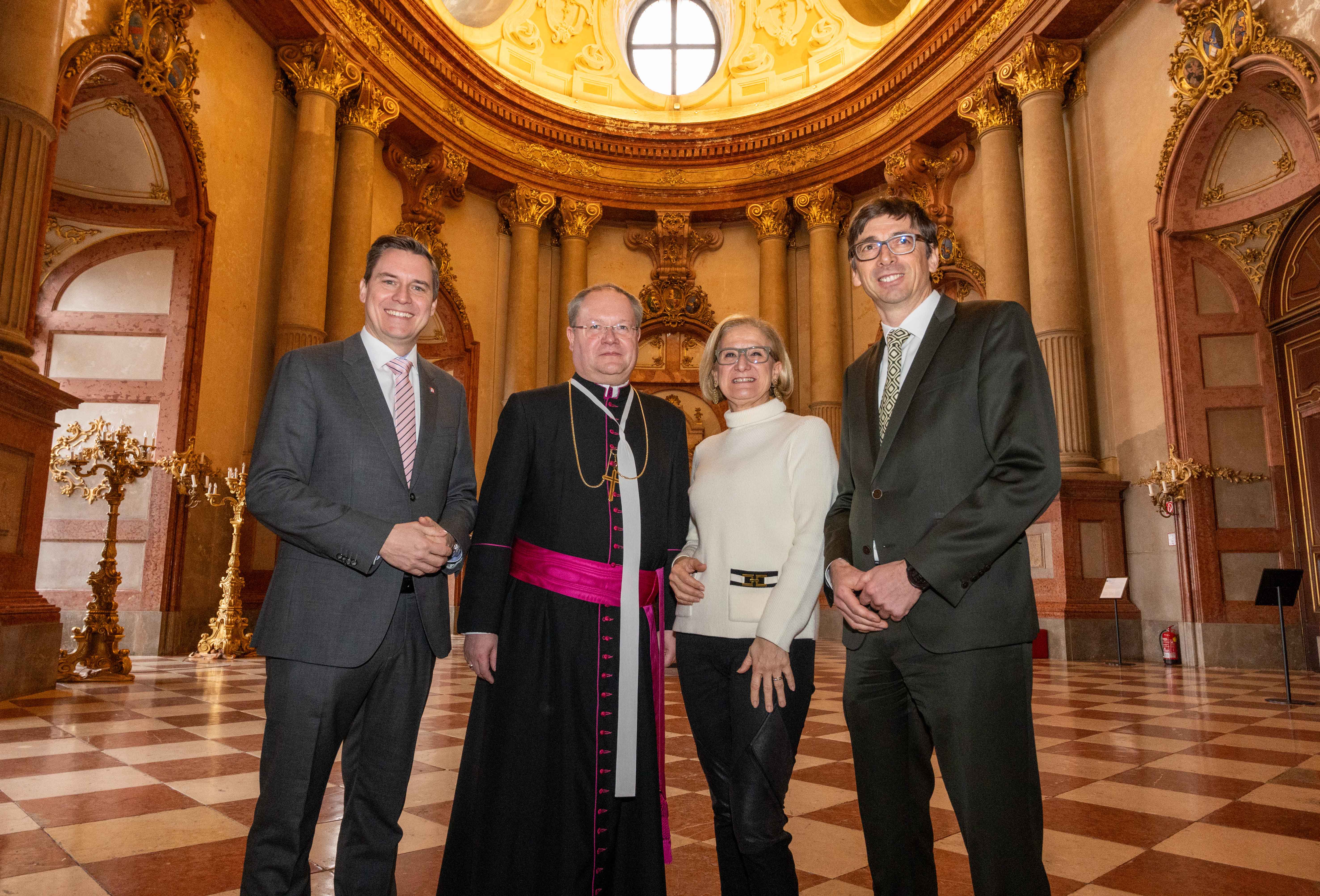 Bild: Bürgermeister Christoph Kaufmann, NÖ Landeshauptfrau Johanna Mikl-Leitner und Propst Anton Höslinger Can.Reg. mit Wirtschaftsdirektor Andreas Gahleitner bei der Pressekonferenz und danach im Marmorsaal des Stiftes