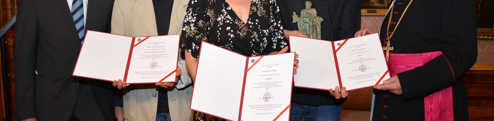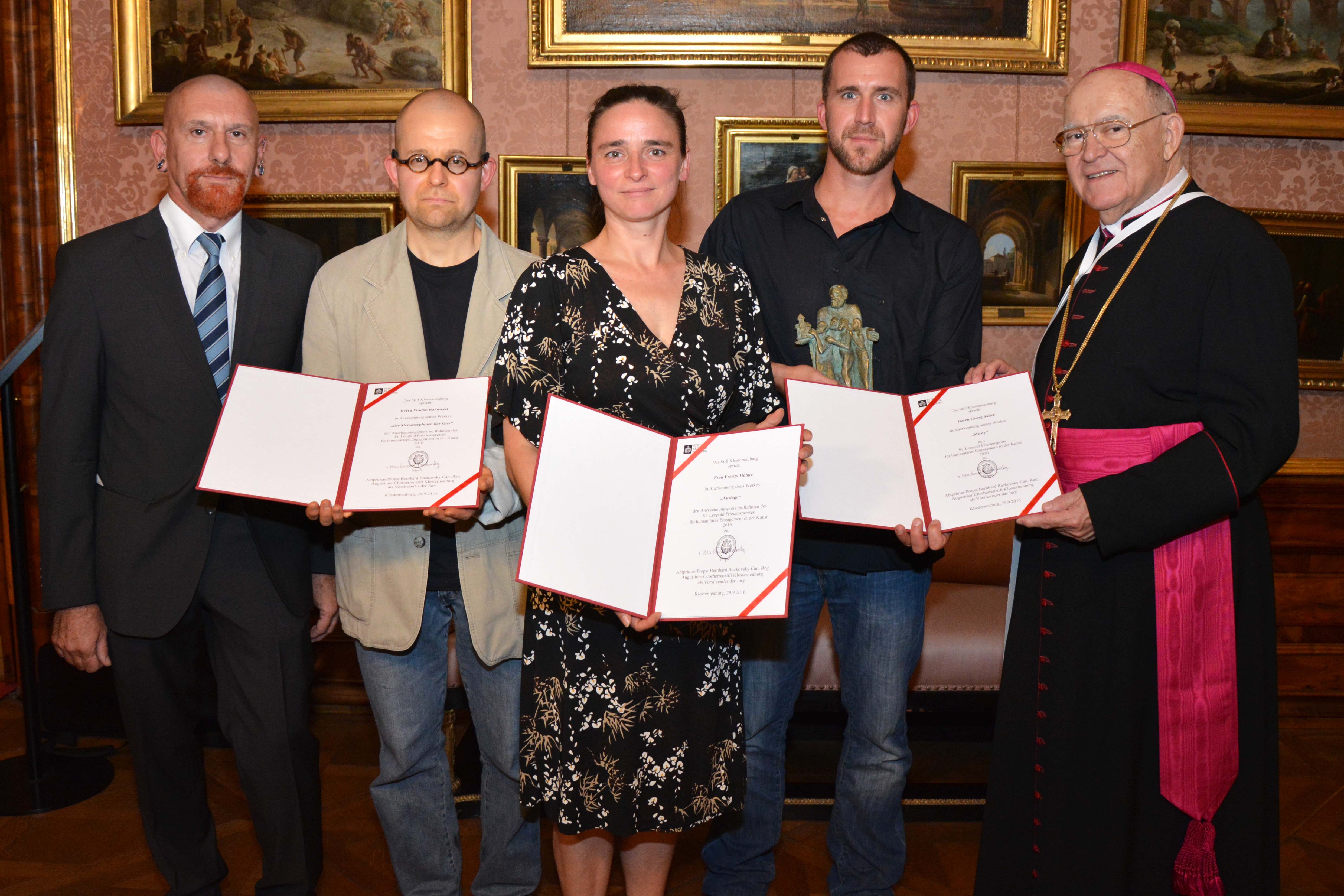 Abtprimas Bernhard Backovsky verlieh den „St. Leopold Friedenspreis 2016“ an den Künstler Gregor Sailer und je einen Förderpreis an Frenzy Höhne und Wadim Rakowski.
