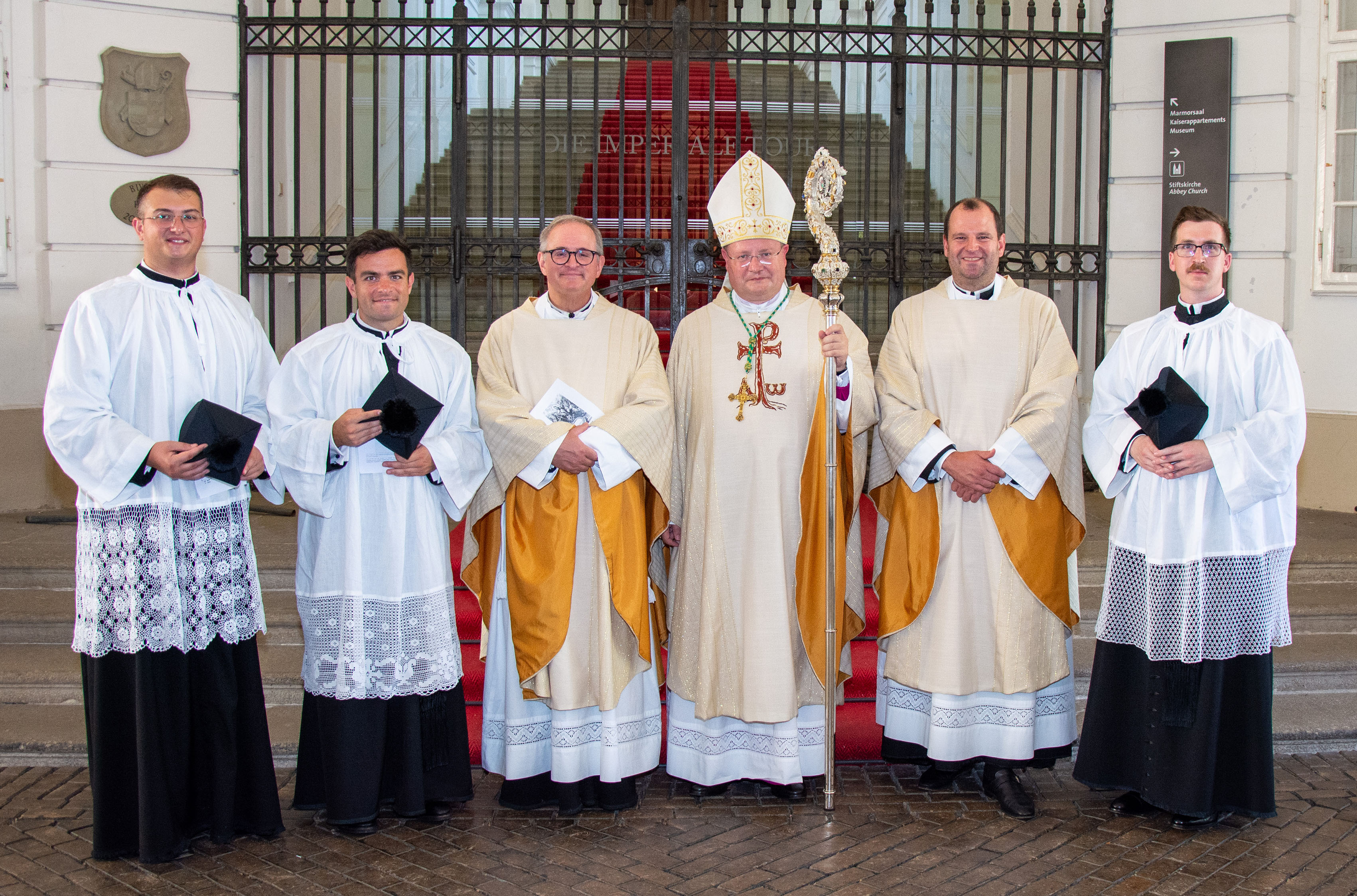 Foto: v.l.n.r.: Jona Capobianco, Nathanael Appel, Stiftsdechant Clemens Galban, Propst Anton Höslinger,