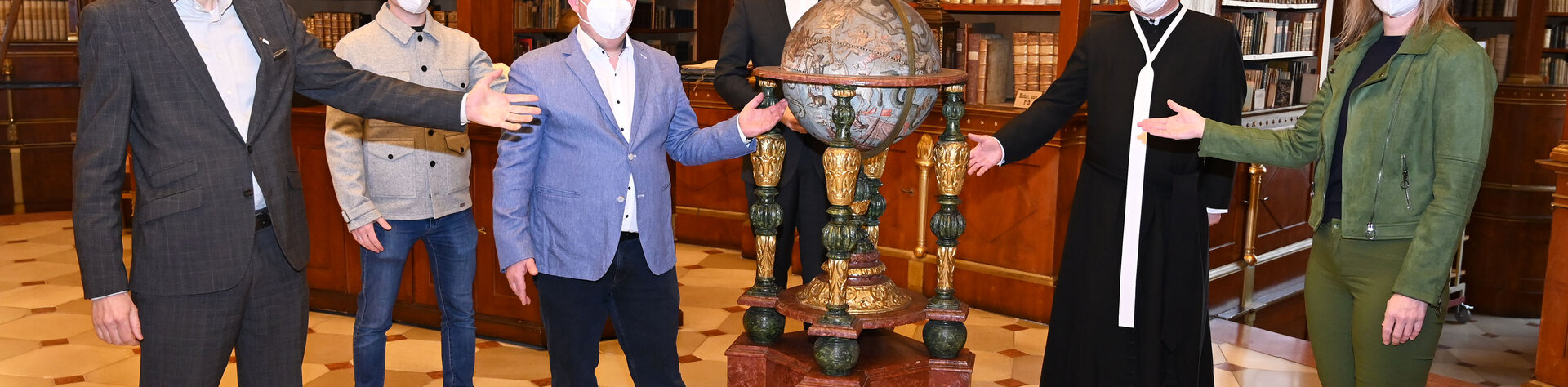 Bildtext: V.l.: Direktor Andreas Gahleitner, die Stadträte Mag. Clemens Ableidinger, und Leopold Spitzbart, Bürgermeister Mag. Stefan Schmuckenschlager, Augustiner-Chorherr Anton Höslinger und Stadträtin Verena Pöschl rücken die Erdkugel und ihre Energieressourcen ins Zentrum des Handelns.