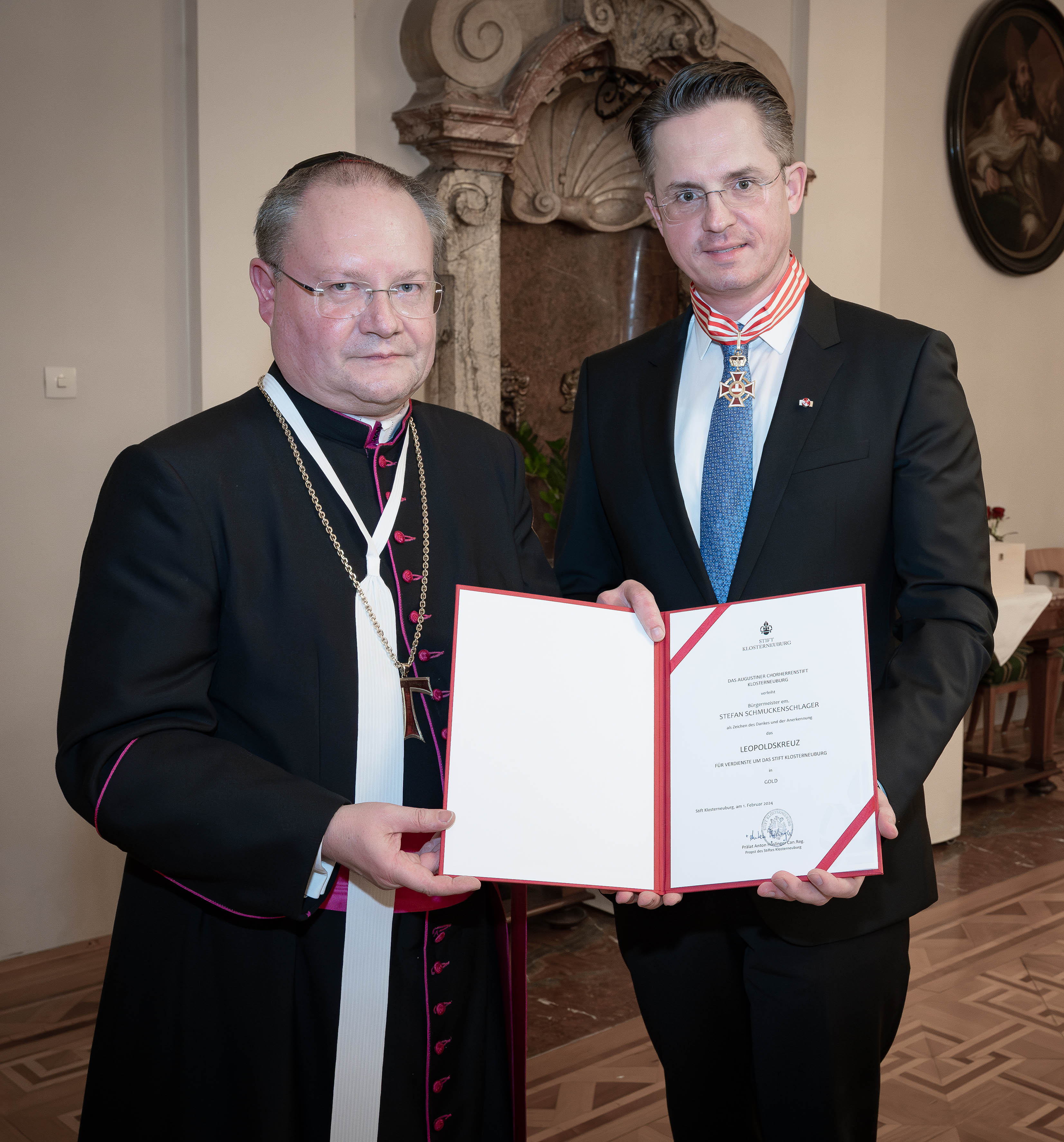 Für seine Verdienste um das Stift Klosterneuburg erhielten am 1. Februar 2024, der ehemalige Bürgermeister der Stadtgemeinde Klosterneuburg, Stefan Schmuckenschlager, durch Propst Anton Höslinger, das „Leopoldskreuz in Gold“, verliehen.