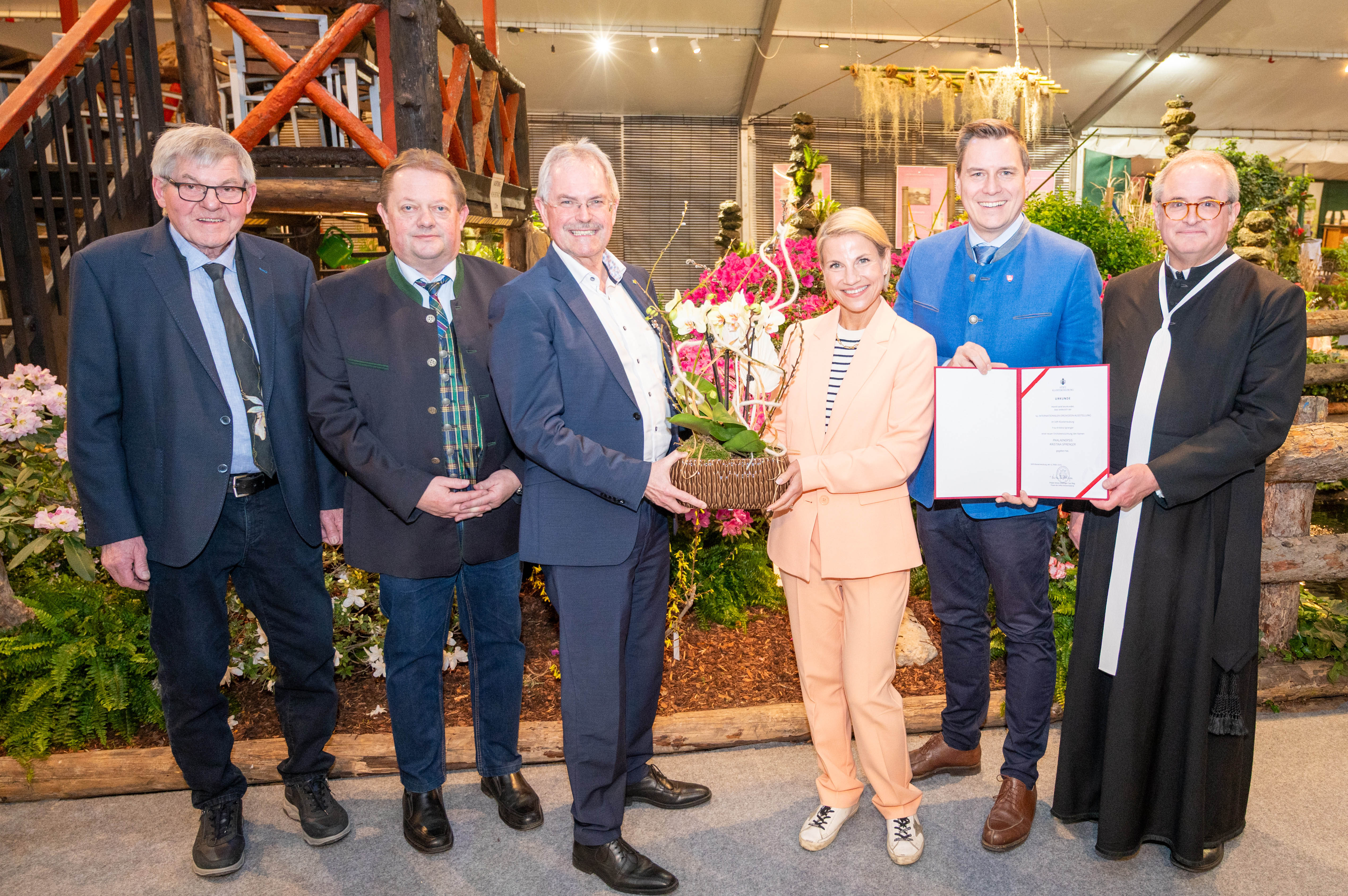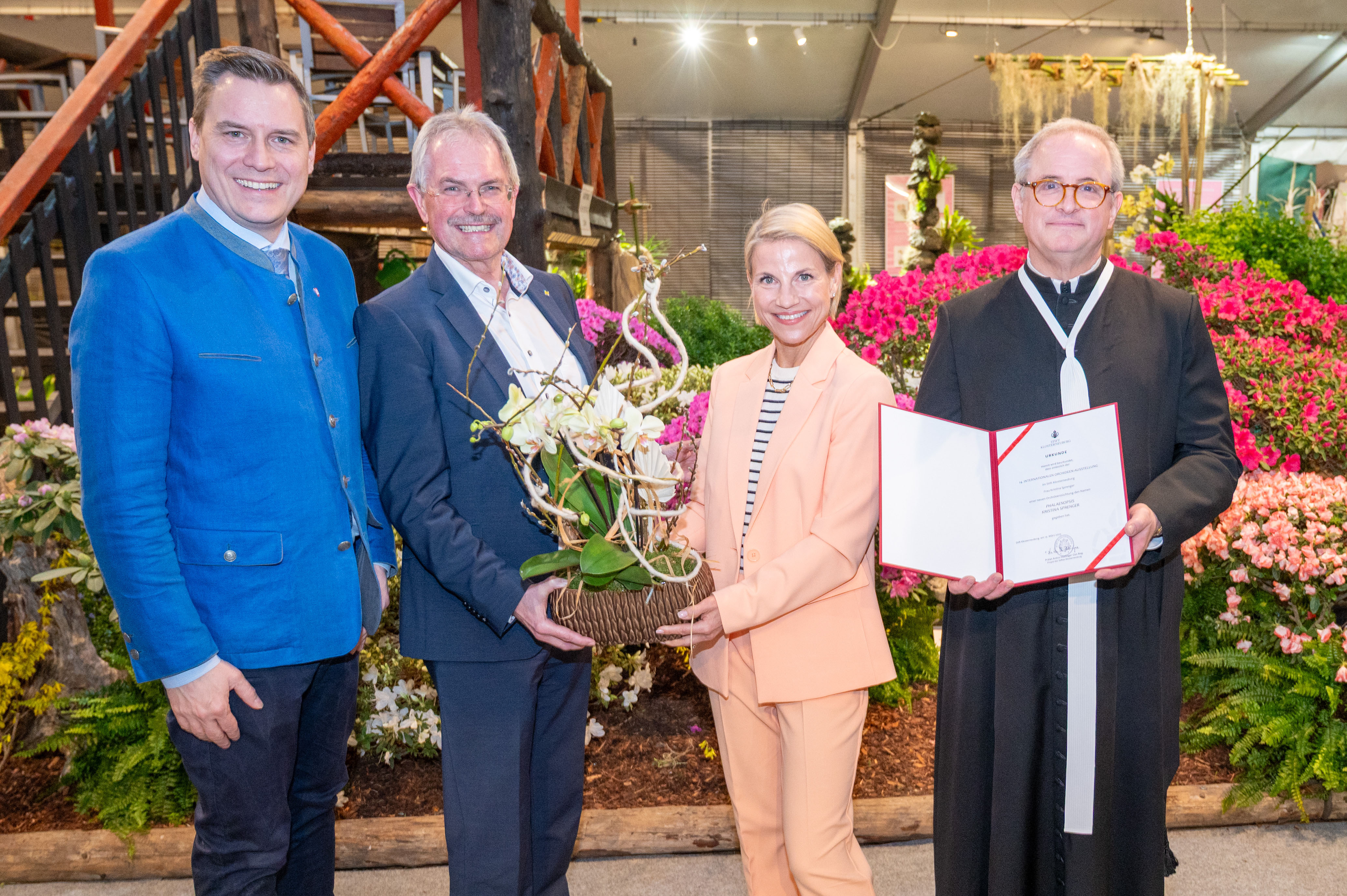 Foto 1: Orchideenzüchter Peter Kopf, Leiter der Stiftsgärten Josef Bauer, Präsident des NÖ-Landtags Karl Wilfing, Schauspielerin Kristina Sprenger, Bürgermeister Christoph Kaufmann und Stiftsdechant Clemens Galban Can.Reg.