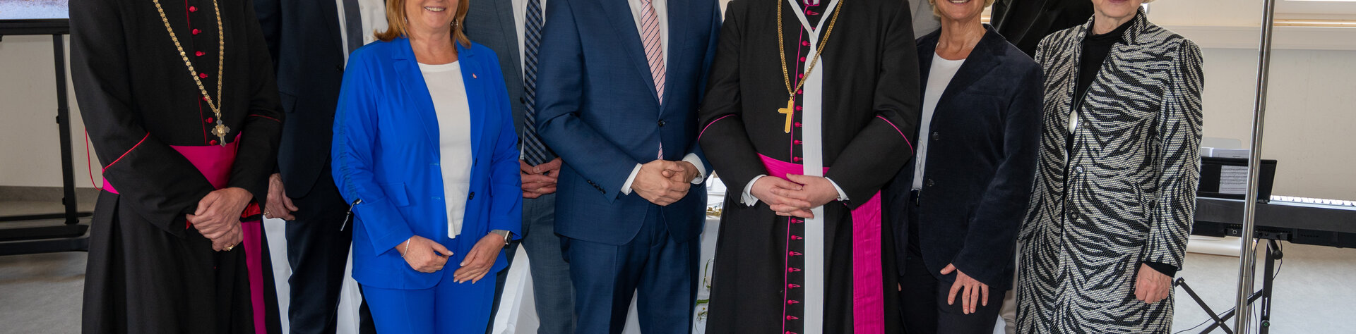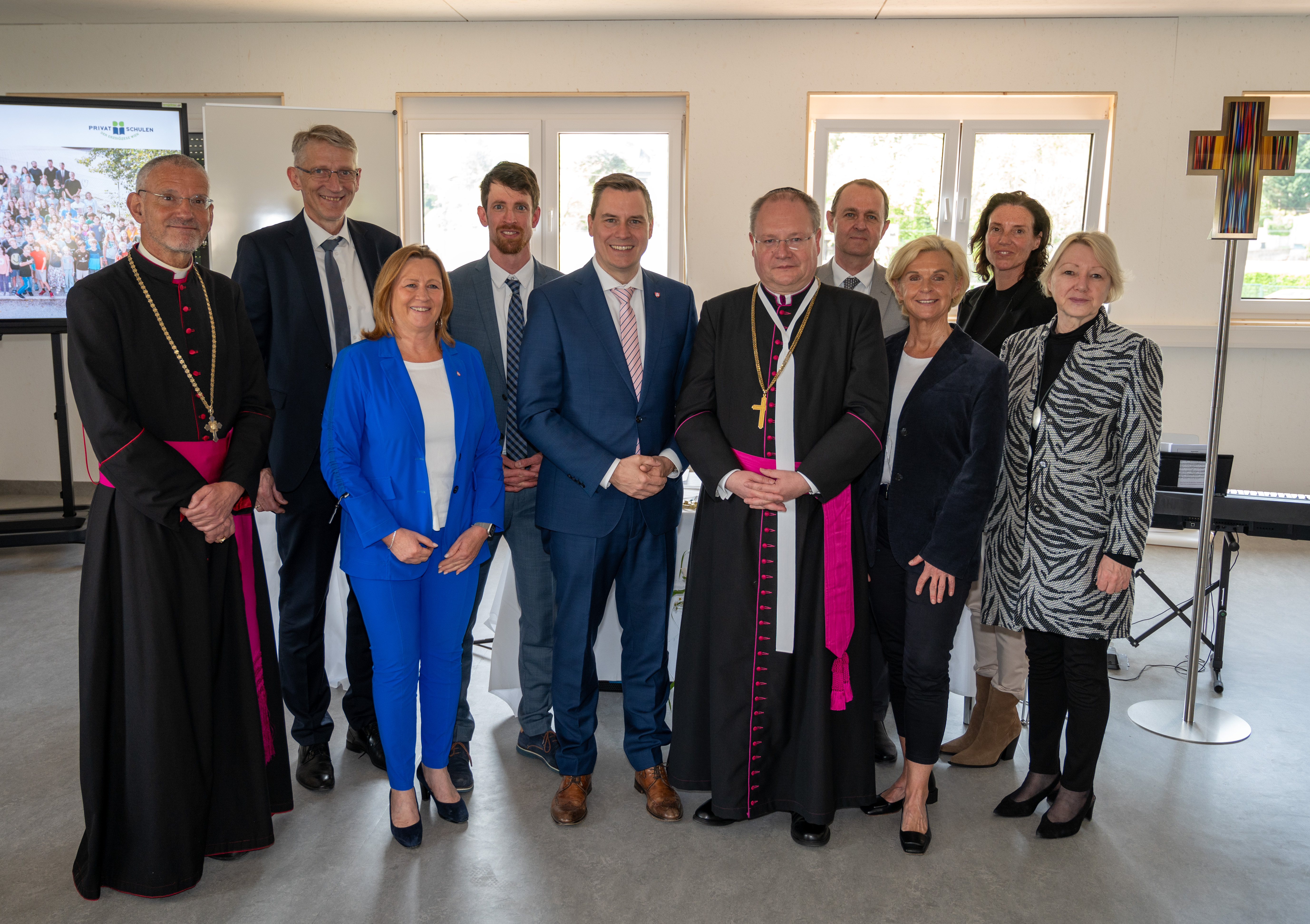 (v.l.n.r.): Generalvikar Nikolaus Krasa, Erzdiözese Wien; Josef Fürst, AL SQM; Maria Theresia Eder, Vizebürgermeisterin und Bildungsbeauftragte, Klosterneuburg; Johannes Poyntner, Direktor des pGK; Christoph Kaufmann, Bürgermeister, Klosterneuburg; Prälat Anton Höslinger Can.Reg., Propst Stift Klosterneuburg; Reinhard Hallwirth, pädagogischer Geschäftsführer der Privatschulen der Erzdiözese Wien; Hofrätin Andrea Pinz, Schulamtsleiterin, Erzdiözese Wien;