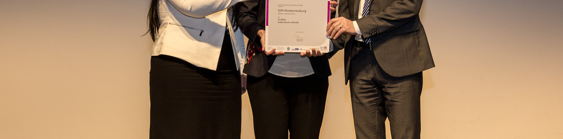 Familienministerin Dr. Sophie Karmasin zeichnete am 14.11.2017 das Stift Klosterneuburg für den erfolgreichen Abschluss der vereinbarten Maßnahmen im Zuge des Audits „berufundfamilie“ aus. Damit wurde die bereits seit 2011 erteilte Zertifizierung zum dritten Mal um weitere drei Jahre verlängert. Mit dem staatlichen Gütezeichen werden Unternehmen und Institutionen ausgezeichnet, die gute Rahmenbedingungen für die Vereinbarkeit von Beruf und Familie schaffen.