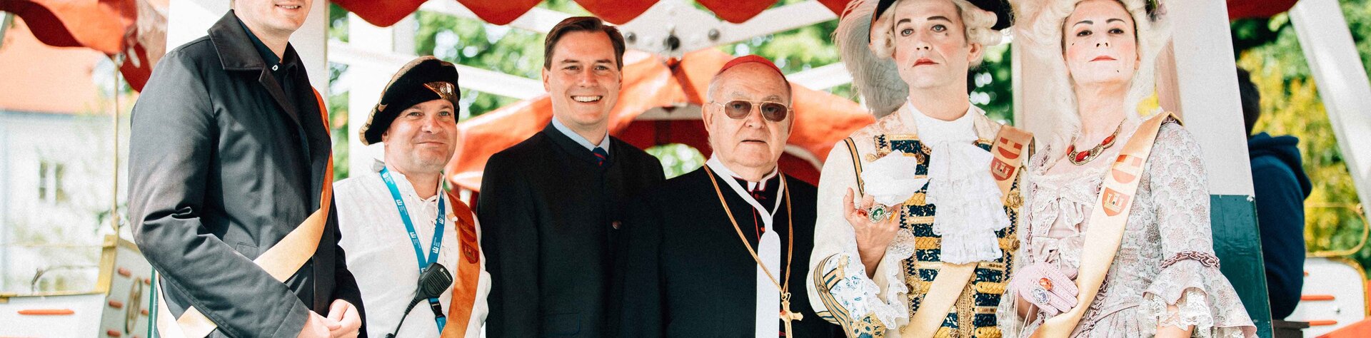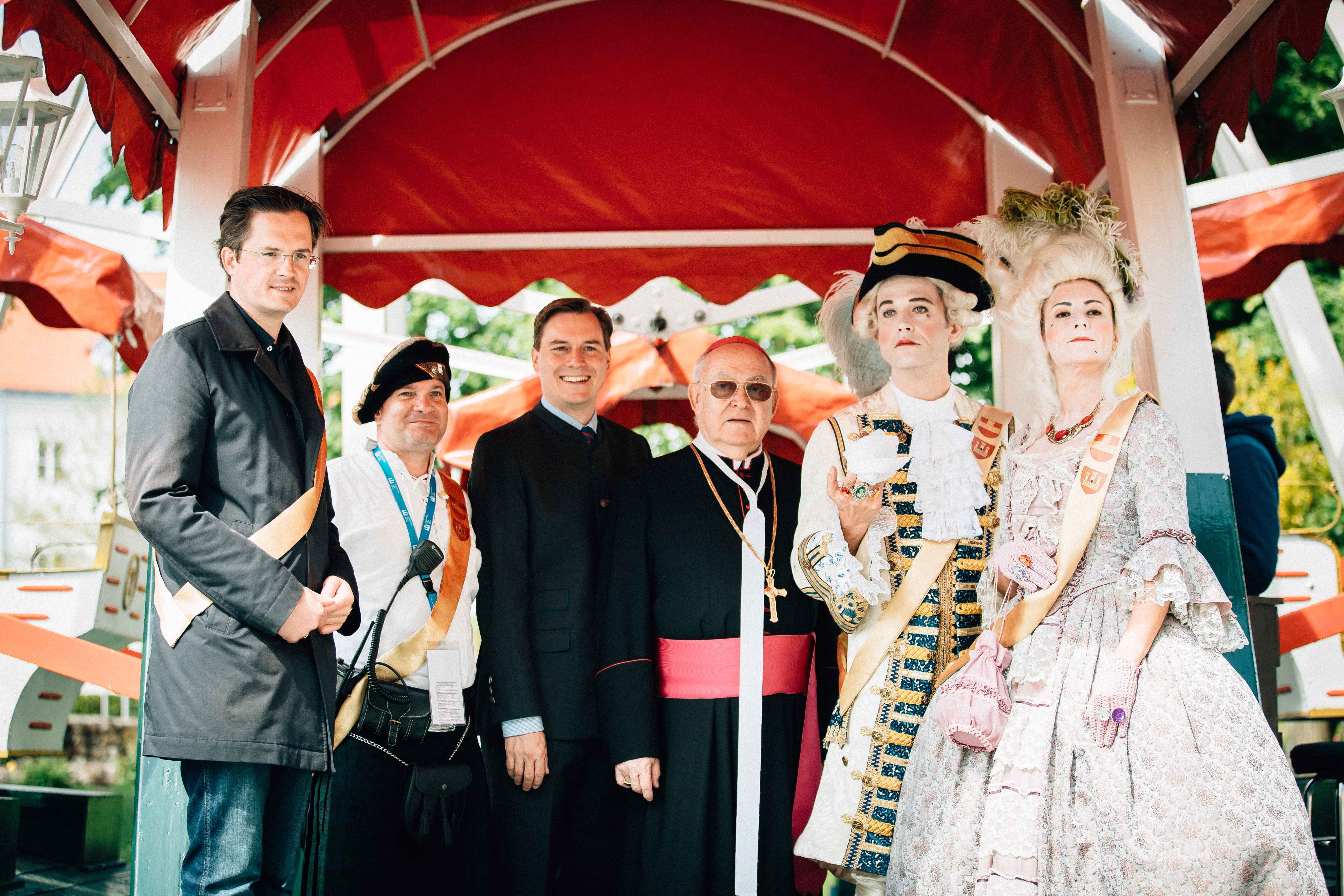 Bildtext: Das Familienfest wurde durch Bürgermeister Mag. Stefan Schmuckenschlager, Alexander Lung, Leiter des Marktamts, LAbg. Stadtrat Christoph Kaufmann, MAS, Generalabt Propst Bernhard Backovsky, Johann Josef von Khevenhüller-Metsch (Gottfried Fragner, Leiter der Kulturabteilung des Stifts Klosterneuburg) und Maria Wilhelmina von Auersperg (Nicola Askapa, Leiterin Stadtmarketing) feierlich eröffnet.