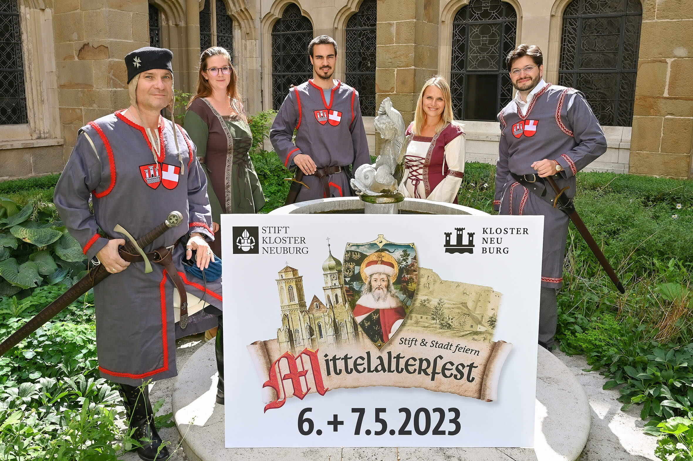 Bildtext: 2023 taucht Klosterneuburg wieder tief ins Mittelalter ein – Alexander Lung u. Julia Hofmeister, Stadtgemeinde / Marktamt, sowie Matthias Hofmeister-Kiss, Kerstin Friedl u. Alexander Potucek vom Stift Klosterneuburg, (v.l.) haben sich schon eingestimmt.