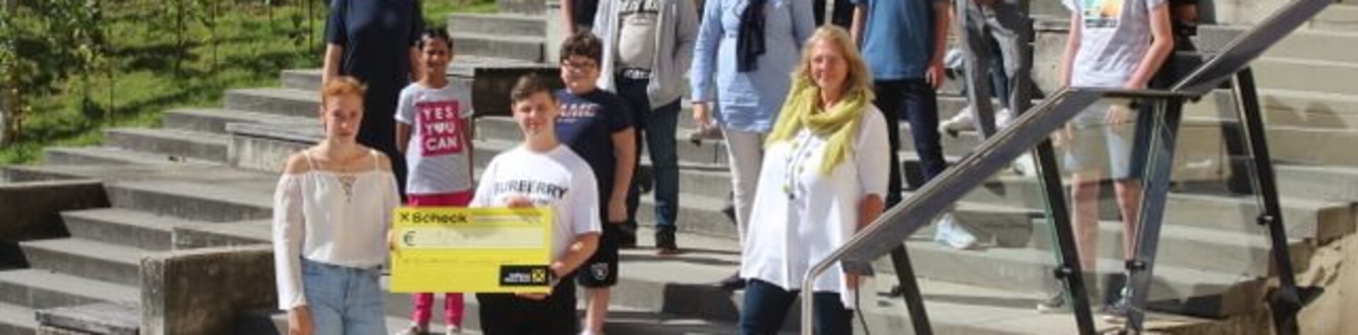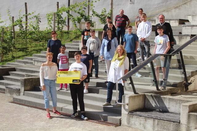 Foto: Die erfolgreichen Firmlinge mit der symbolischen Scheckübergabe an die Leiterin des Standortes Klosterneuburg
