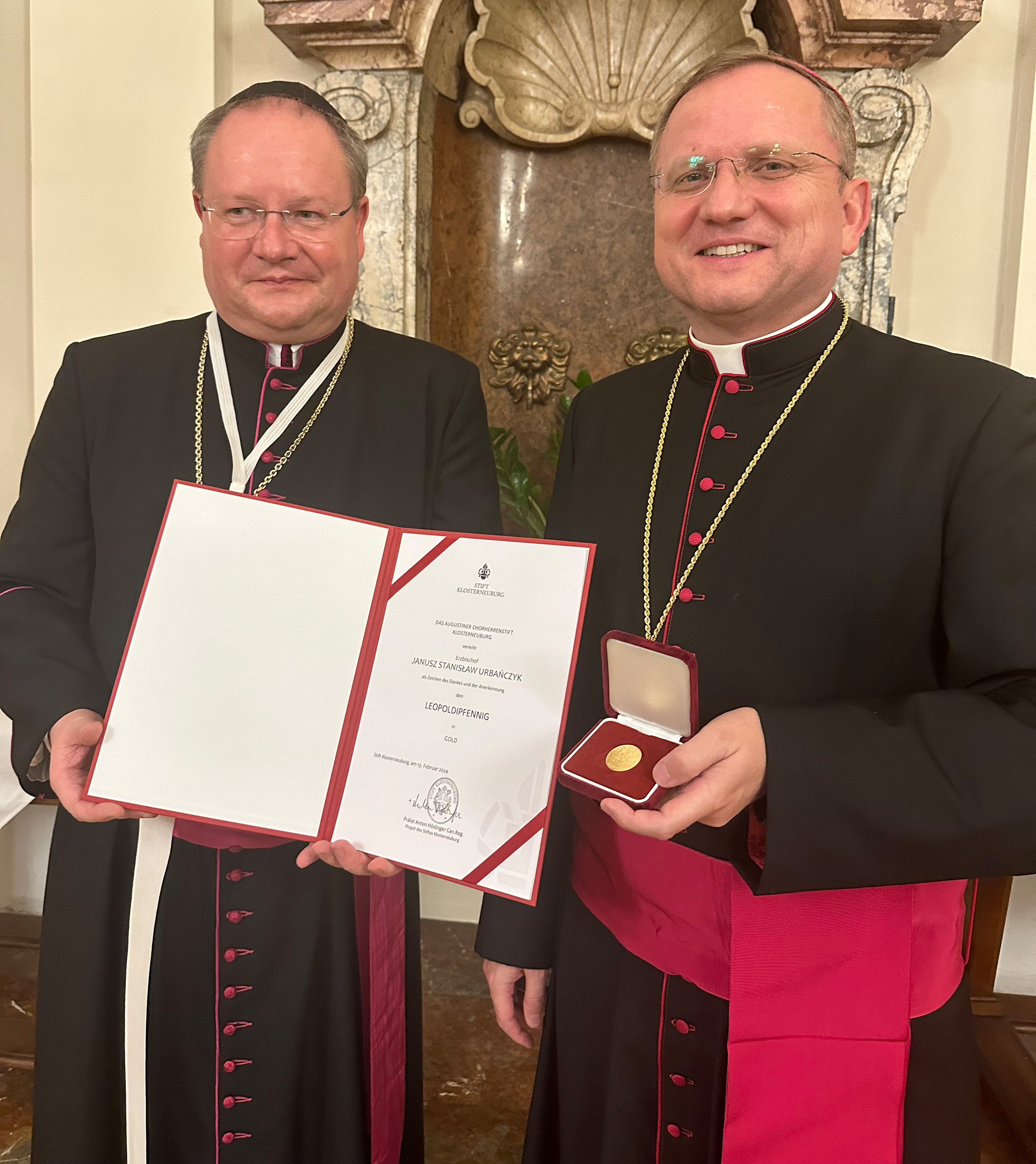 Auf Einladung von Propst Anton Höslinger war Janusz Urbańczyk anlässlich seiner Ernennung zum Erzbischof und zum Apostolischen Nuntius in Simbabwe am 13. Februar 2024 zu Gast im Stift Klosterneuburg. Er überreichte als Zeichen der Anerkennung und zur Erinnerung an Klosterneuburg Erzbischof Urbańczyk einen Leopoldipfennig in Gold.