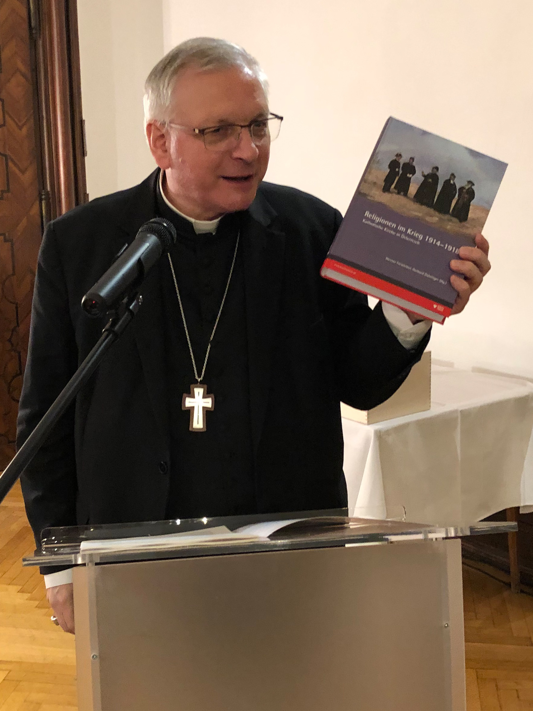Den mit dem Katholischen Bildungswerk Wien gemeinsam ausgerichteten öffentlichen Teil der Jahresversammlung bildete ein Vortragsabend zum Thema „Kirche im Krieg“. Der Hauptreferent, Militärbischof Dr. Werner Freistetter, sprach über die katholische Militärseelsorge und Liturgie im Ersten Weltkrieg. Anschließend stellte Univ.-Prof. Dr. Andreas Redtenbacher als Direktor des Pius-Parsch-Instituts das Forschungsprojekt „Kriegstagebuch von Pius Parsch 1915-1918“ vor: „Die ersten konkreten Impulse der Volksliturgischen Bewegung sind in den sechs Bände umfassenden Kriegstagebuch von Pius Parsch zu entdecken“.