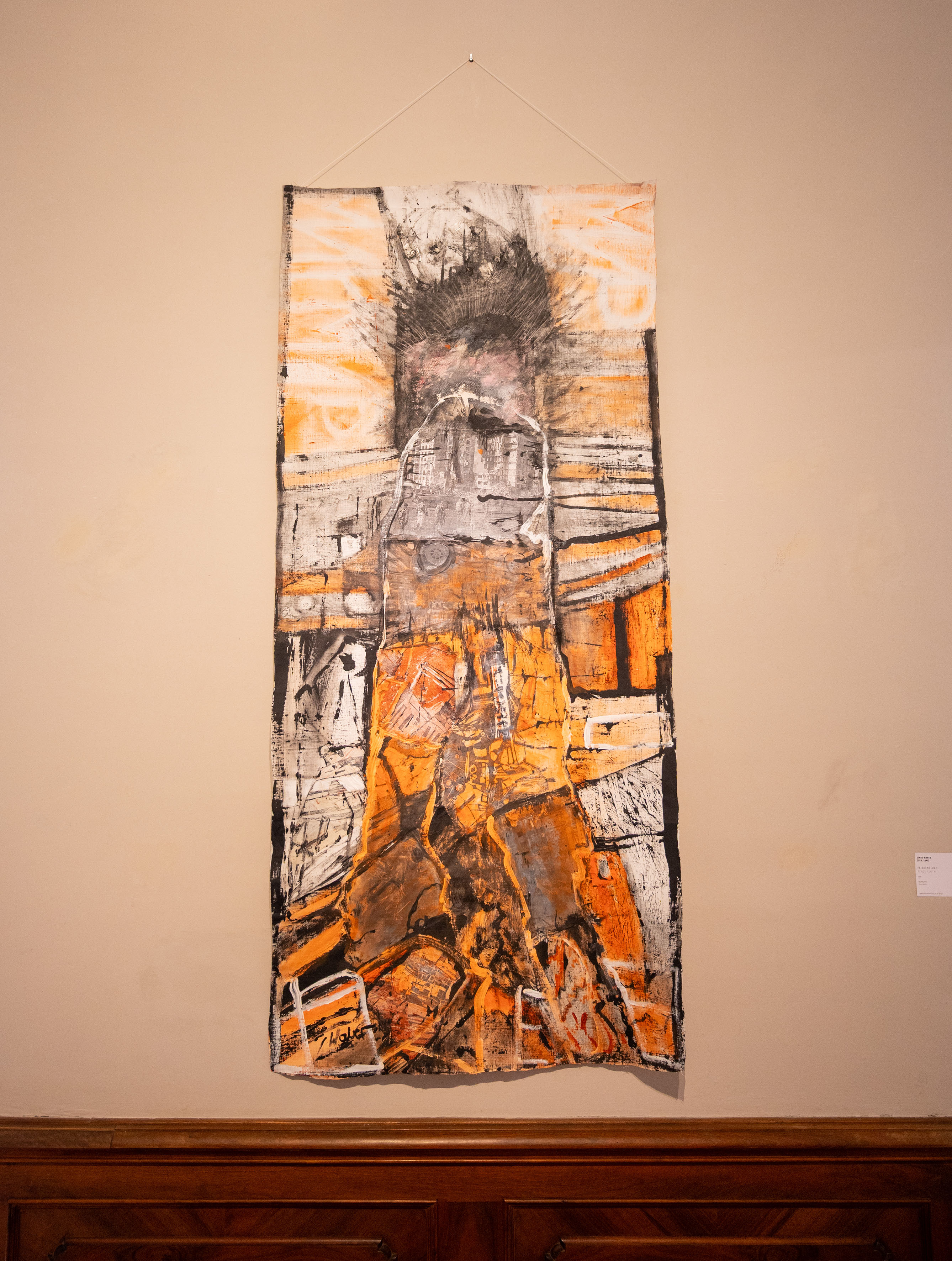 Dem Werk gegenüber findet sich Linde Wabers Friedenstuch, welches als Teil einer größeren Serie entstanden ist. Ihre Bildsprache ist drastisch und führt das Publikum direkt in die Kämpfe des Ukraine-Krieges. Zentral ins Bild collagiert sind Zeitungsausschnitte von zerstörten Häuserzeilen, Panzern und Soldaten, sie beschreiben eindrücklich und unmissverständlich das Grauen des Krieges. Krieg und Frieden kommen nur gerufen – so die Aussage der Künstlerin.