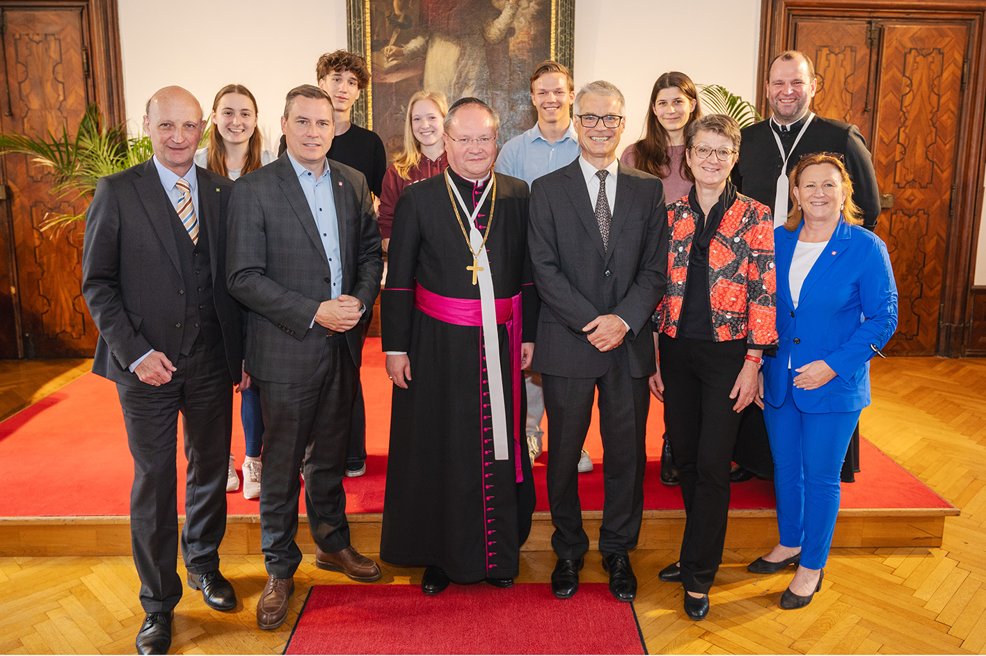Gruppenbild: v.v.l.n.r.: Bezirkshauptmann Andreas Riemer, Bürgermeister Christoph Kaufmann, Propst Anton Höslinger, Johannes Schönner vom Karl von Vogelsang-Institut, Schuldirektorin Hemma Poledna, Vizebürgermeisterin Maria Therasia Eder; dahinter Religionslehrer Chorherr Tassilo Lorenz mit den Klassensprechern der 7. Klasse.