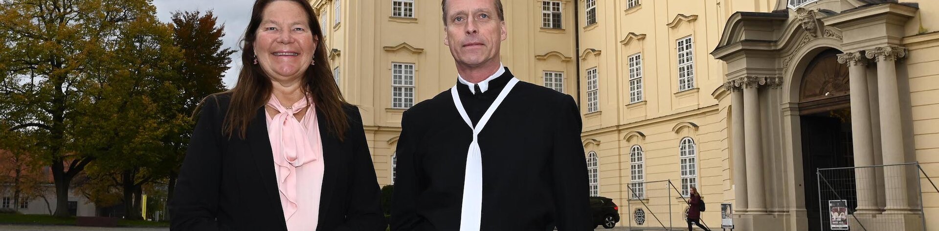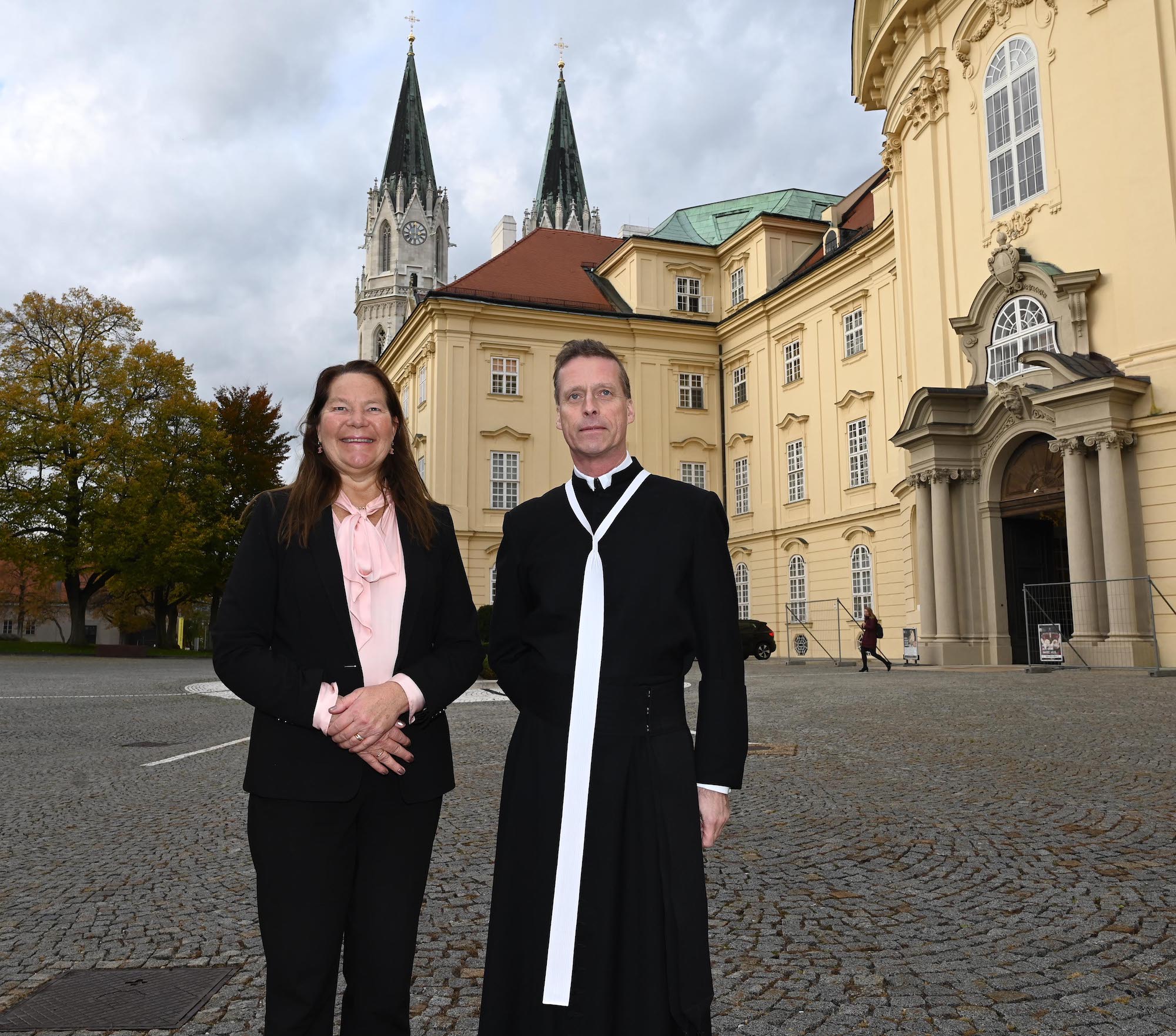 Augustiner-Chorherr Nicolaus Buhlmann Empfang die schwedische Botschafterin Annika Markovic im Stift Klosterneuburg.