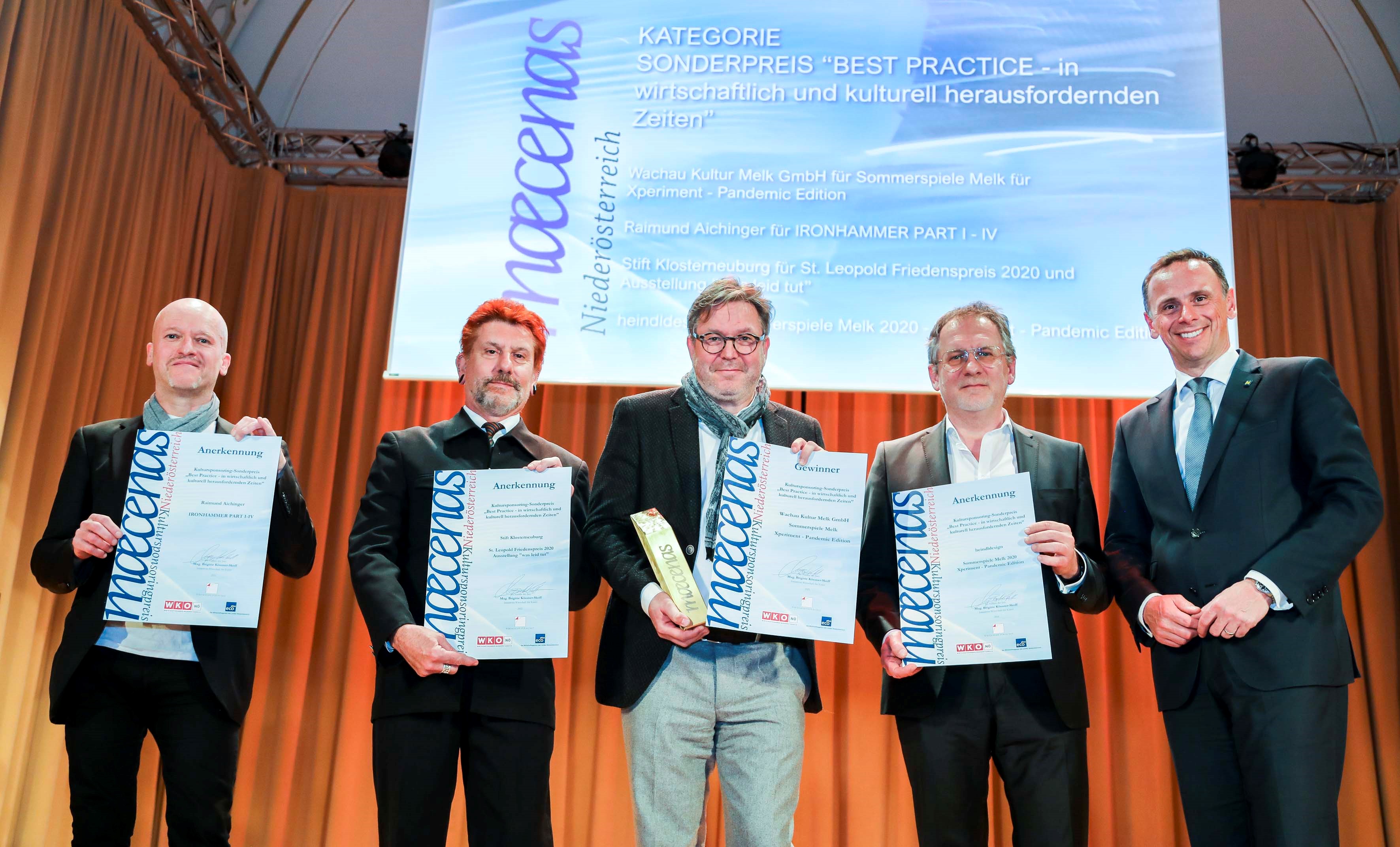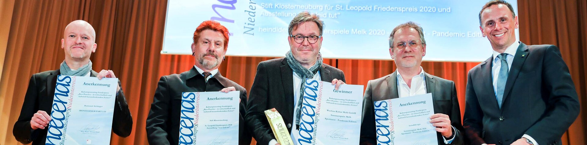 03.05.2022Die Initiativen Wirtschaft für Kunst vergaben bei einem Festakt in Wiener Neustadt am 28.04.2022 in Kooperation mit der Wirtschaftskammer Niederösterreich, unterstützt von ecoplus - Die Wirtschaftsagentur für Niederösterreich - die Niederösterreichischen Kultursponsoring-Preise 2020. & 2021 an Unternehmen für die Förderung von Kulturprojekten, die ohne diese Unterstützung nicht hätten verwirklicht werden können. Die Preise für Kulturanbieter zeichneten das erfolgreiche Engagement in Kooperation mit der Wirtschaft aus.