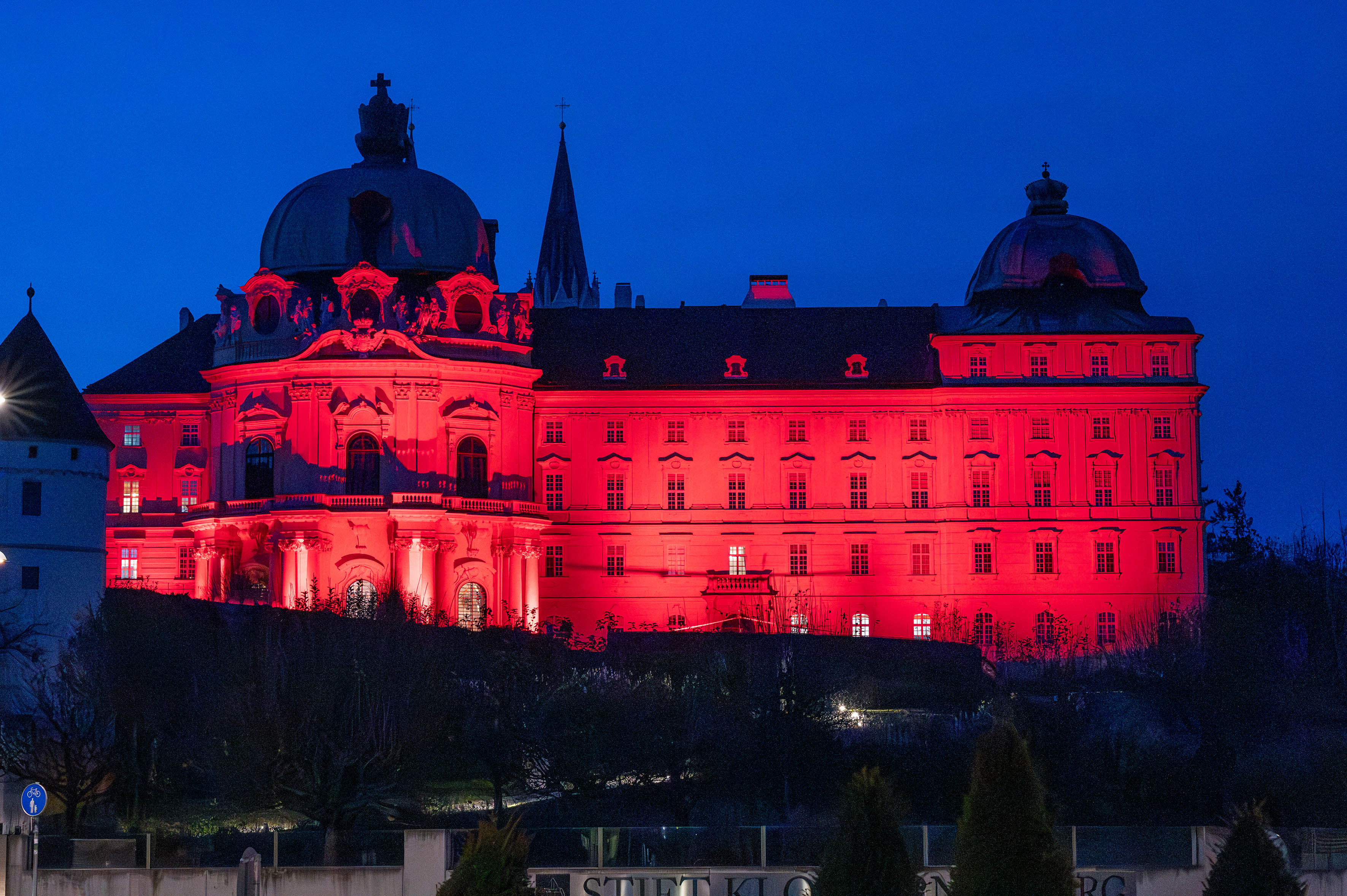 Der „Red Wednesday“ hat heuer erstmals auch das Augustiner-Chorherrenstift Klosterneuburg in strahlendes Rot getaucht. Zusammen mit bedeutenden Kirchen und öffentlichen Gebäuden in Österreich und weltweit setzte das Stift ein weithin sichtbares Zeichen gegen die Verfolgung von Christinnen und Christen sowie für das Menschenrecht auf Religionsfreiheit. Die barocke Stiftsfassade mit ihrer markanten Kuppel erstrahlte am 19. November 2025 in intensivem Rot.
