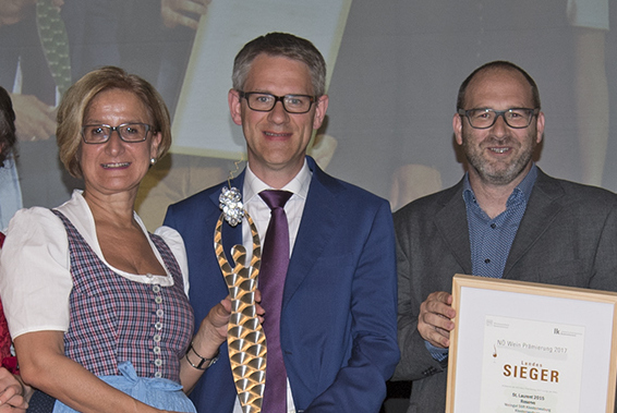 Landeshauptfrau Johanna Mikl-Leitner, Weingutsleiter Wolfgang Hamm und Kellermeister Günther Gottfried freuen sich über den Landessieg mit der Sankt Laurent Reserve vom Weingut Stift Klosterneuburg
