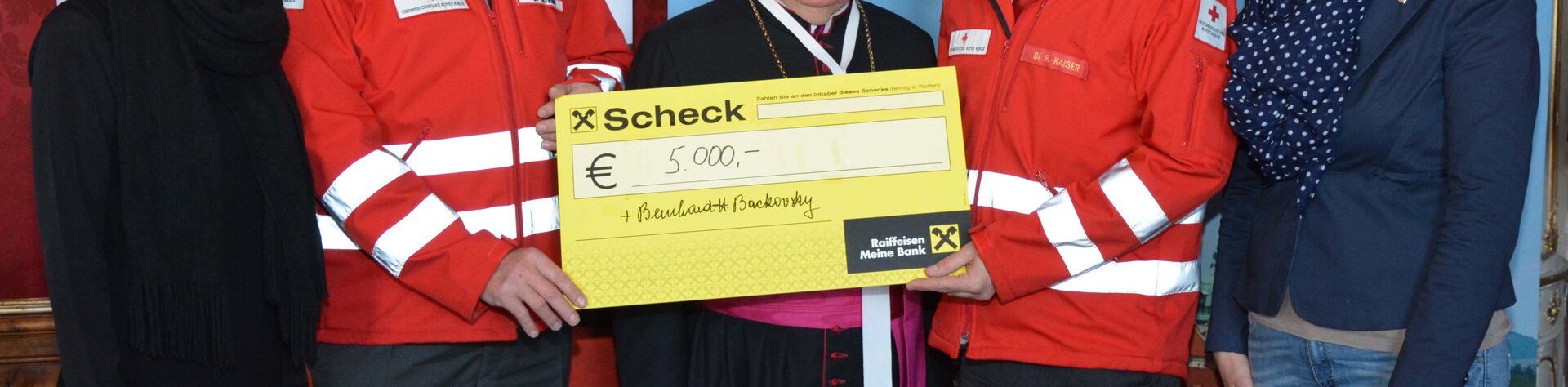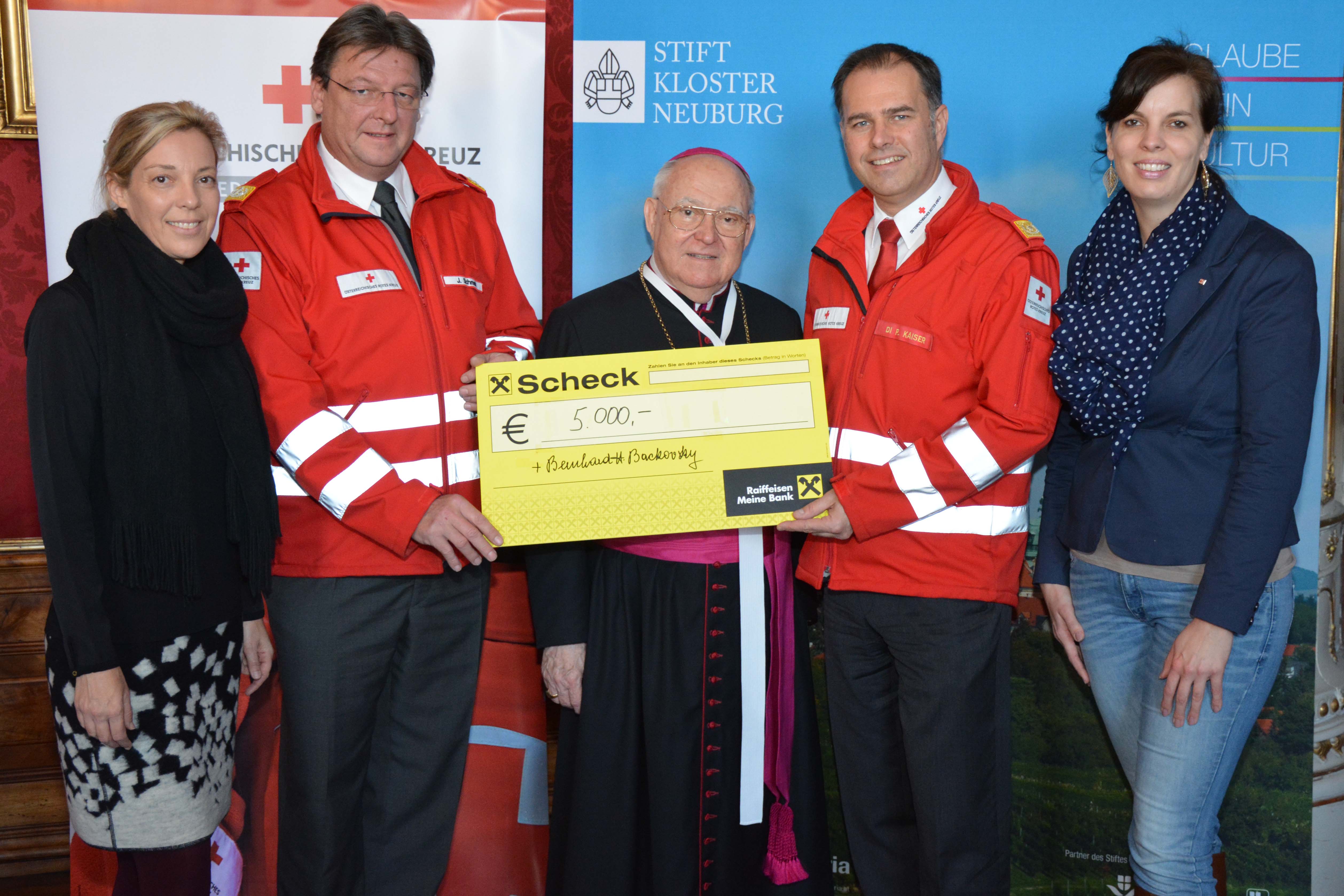 Propst Bernhard Backovsky überreichte 5.000,- Euro an General Josef Schmoll und Landesgeschäftsführer Peter Kaiser, beide Rotes Kreuz Niederösterreich. Mit dieser Spende wird das Projekt für drei Jahre unterstützt.