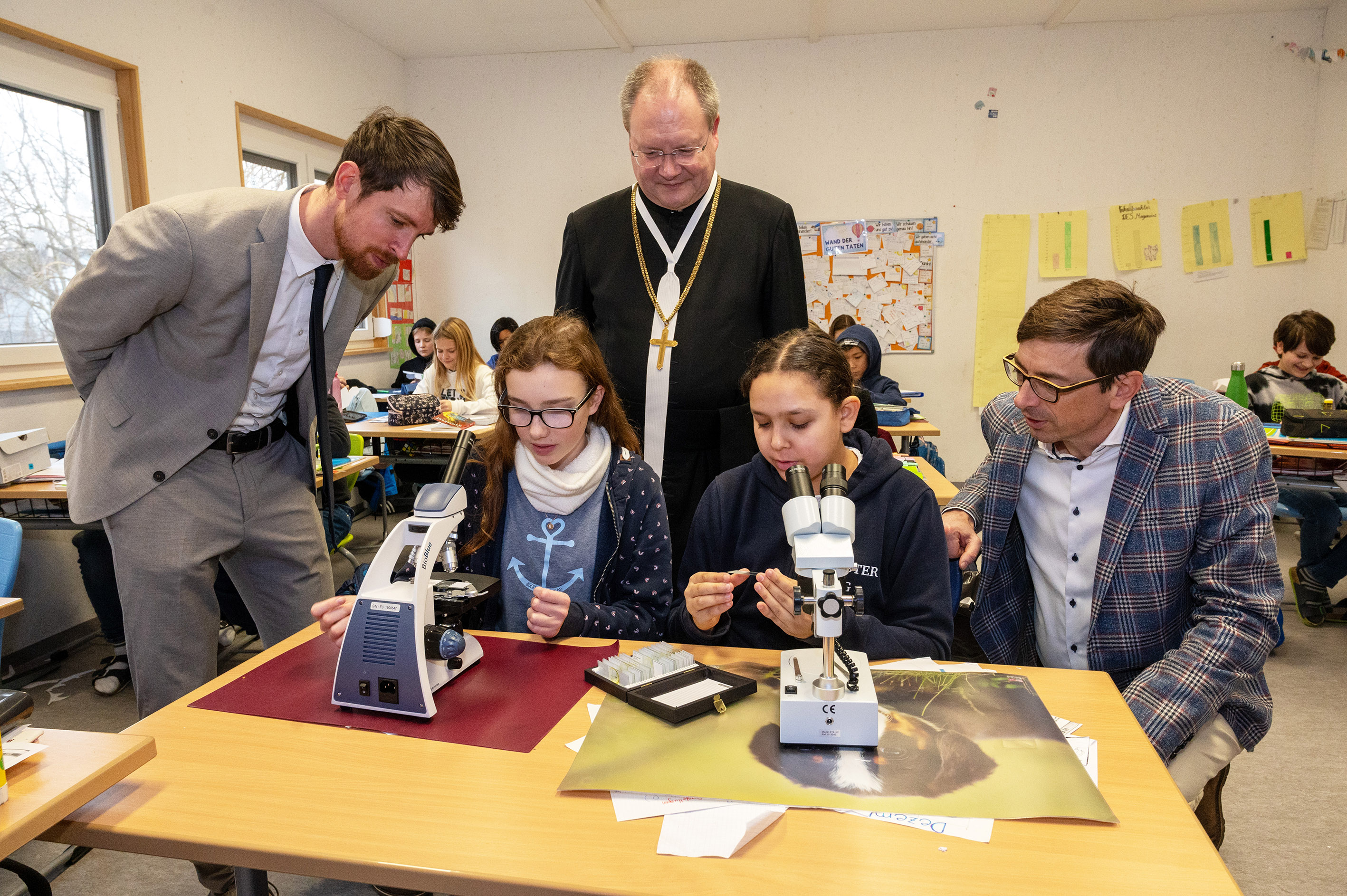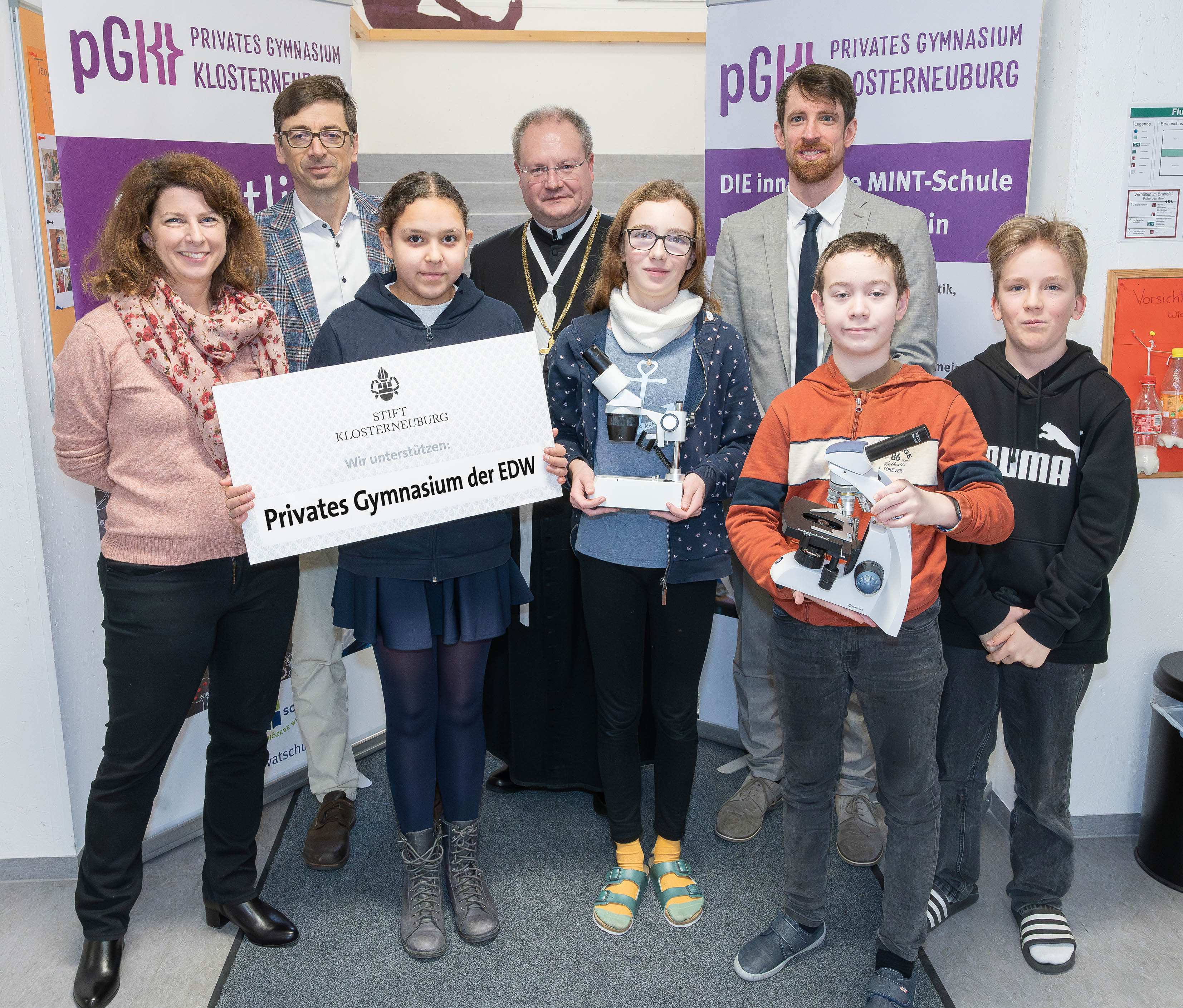 (v.l.n.r.): Prof. Dina Pletschko; Andreas Gahleitner, Wirtschaftsdirektor Stift Klosterneuburg; Prälat Anton Höslinger Can.Reg., Propst Stift Klosterneuburg; Johannes Poyntner, Direktor des pGK mit Schülern aus der Klasse 2A: Mia, Filippa, Robert, Tim Bild 02 | Am Mikroskop