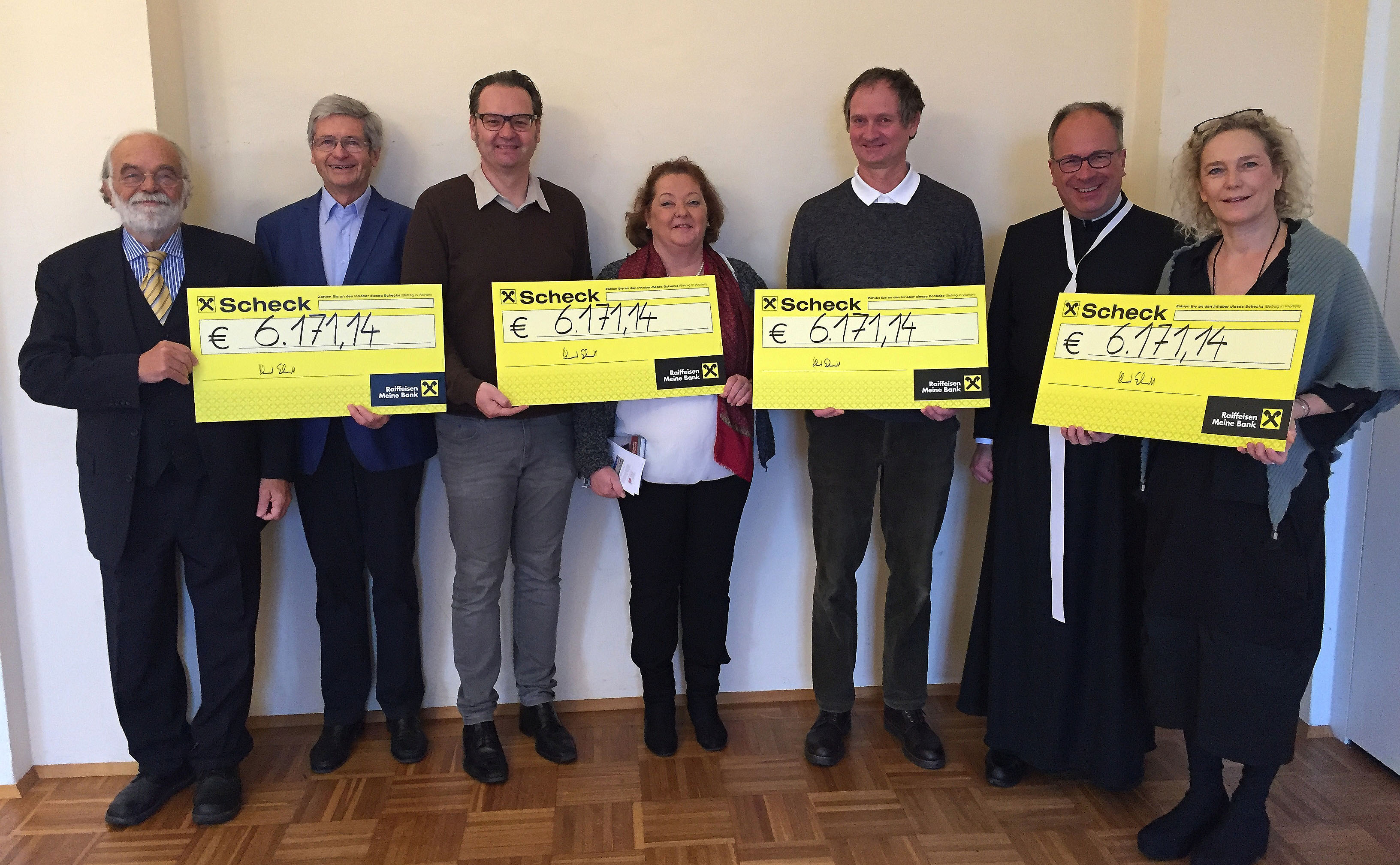26.01.2018An zwei Wochenenden im Dezember 2017 fand der Adventmarkt im Binderstadl der Stiftspfarre Klosterneuburg statt. Dabei wurde ein Reinerlös von 24.684,55 Euro erzielt. Die symbolische Scheckübergabe an die vier, mit jeweils 6.171,14 Euro begünstigten, Sozialprojekte erfolgte am Sonntag, 21. Jänner 2018, im Rahmen der Agape, nach der Heiligen Messe im Pfarrheim des Stiftes Klosterneuburg. Dazu konnten die jeweiligen Vertreter der Begünstigen begrüßt werden, die Interessantes über Ihre Sozialprojekte berichteten: