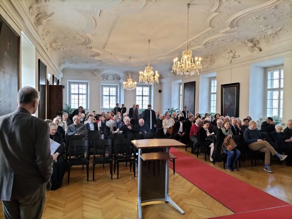 08.03.2023Am Donnerstag, den 4. März 2023, nach drei Corona-Pandemie bedingten Ausfällen, war es wieder soweit: Das Stift Klosterneuburg lud zum Tag der Stiftspfarren. An die 100 Mitglieder der Pfarrgemeinderäte (PGR) und Vermögensverwaltungsräte (VVR) waren mit ihren Priestern (Augustiner-Chorherren und Mitbrüder aus anderen Gemeinschaften) in den Augustinussaal des Stiftes gekommen, um zu erfahren, was es Neues gibt. Administrator Prälat Maximilian Fürnsinn sprach offen über die Situation des Hauses, während der letzten drei Jahre und zeigte auch alle Ereignisse und Reformbewegungen des Stiftes auf, die den Weg in die Zukunft bereiten sollen. Besonders die "verantwortete Selbstleitung" war ihm hier ein großes Anliegen.