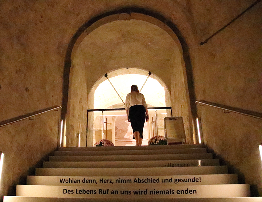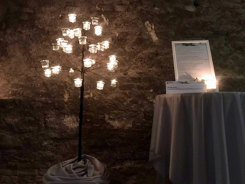Im TrauerRaum gibt es Stationen zum Nachdenken und Nachspüren. So wirkt allein die Stille im Gewölbekeller, Texte stimmen ein, symbolische bzw. rituelle Handlungen wirken auf physischer, psychischer und emotionaler Ebene: Die Schwere des kühlen Steines, die schwere Last, kann der reinigenden Kraft des Wasser übergeben werden. Das Knüpfen eines weißen Bandes auf einen Olivenbaum verspricht Versöhnung, Wut und Kummer können an der Klagemauer abgegeben werden, das Anzünden einer Kerze bringt Licht und Hoffnung. Der/die Besucher*in kann sich mit der Trauer auseinandersetzen, sich einlassen, für sich allein, selbsttätig und in Stille. Daneben gibt es auch die Möglichkeit zum persönlichen Gespräch mit einem/r ehrenamtliche/n Mitarbeiter*in des Vereins Hospiz St. Martin und/oder eines Priesters.