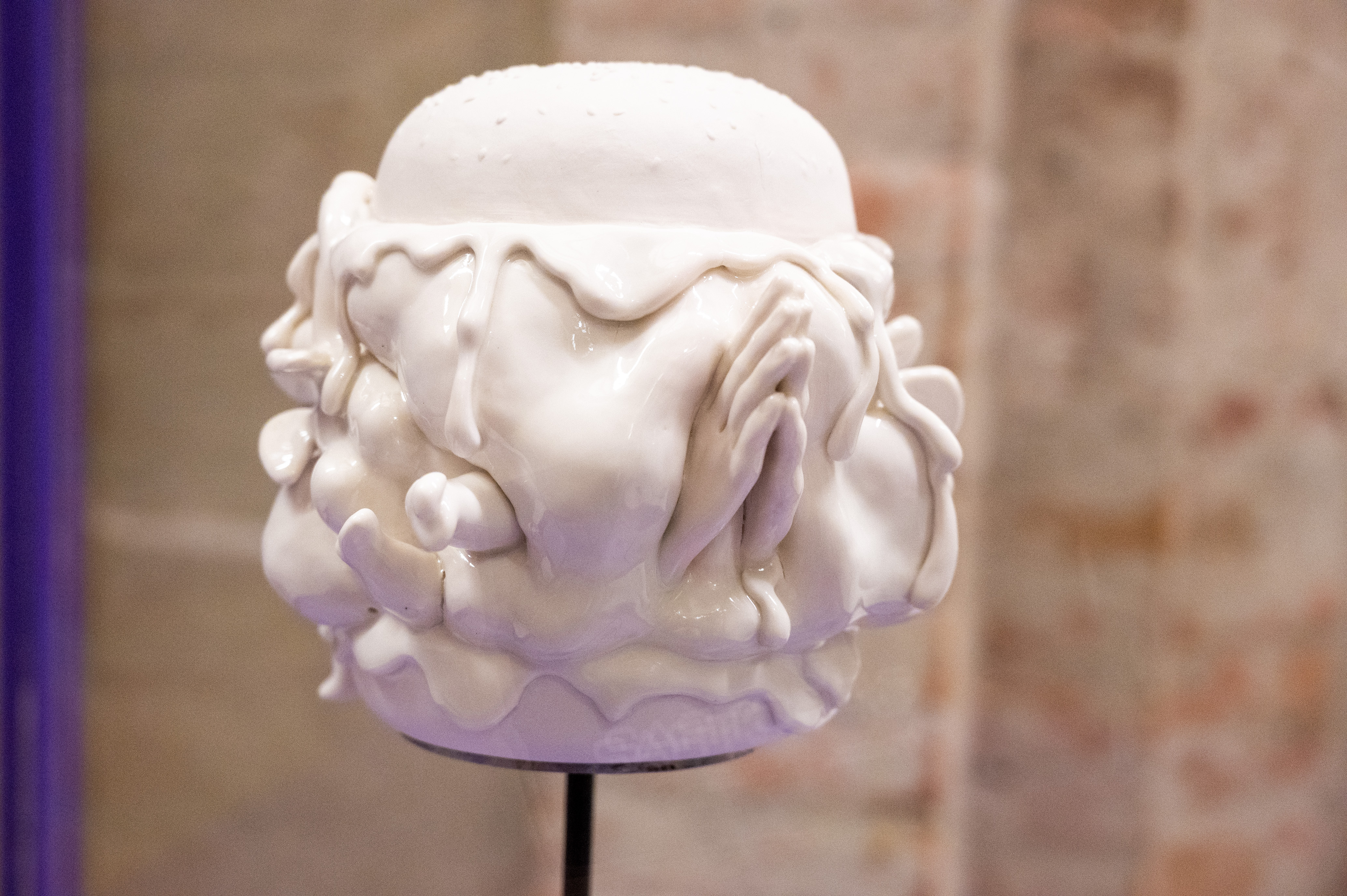 - Einen Anerkennungspreis erhielt die aus Russland stammende Künstlerin Julia Belova (*1991) für ihre Porzellanskulptur „Baroque Burger“. Das Werk der Keramikerin besticht mit seiner Barockästhetik und dem Kontrast zwischen der scheinbaren Wegwerfqualität von Fastfood und dem edlen Material mit religiösen Symbolen wie betenden Händen, blutenden Herzen und Putten.