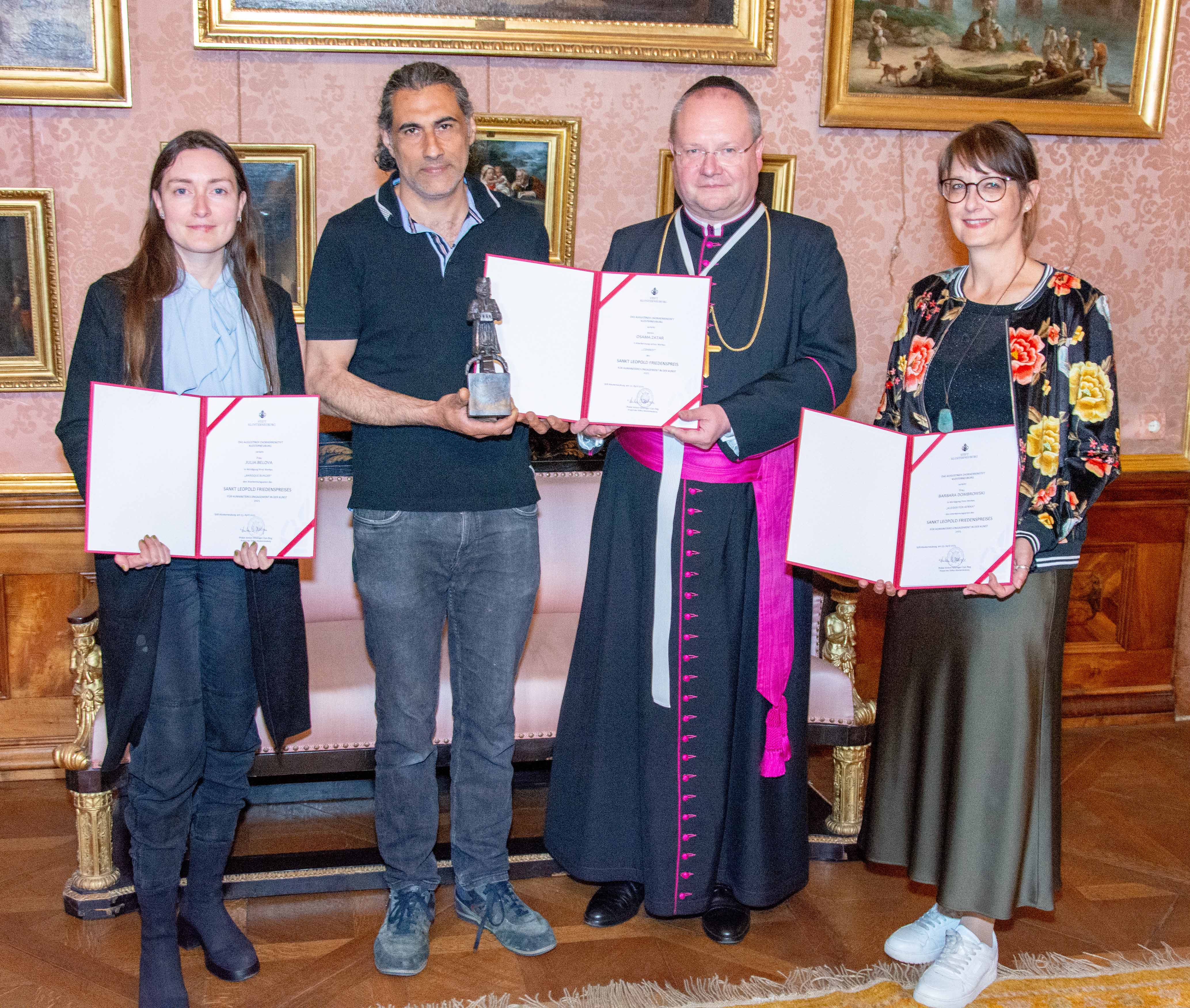 Prälat Anton Höslinger, Propst des Stiftes Klosterneuburg, zeichnete Bildhauer Osama Zatar mit dem St. Leopold Friedenspreis 2025 aus. Die Künstlerinnen Julia Belova und Barbara Dombrowski erhielten je einen Anerkennungspreis.