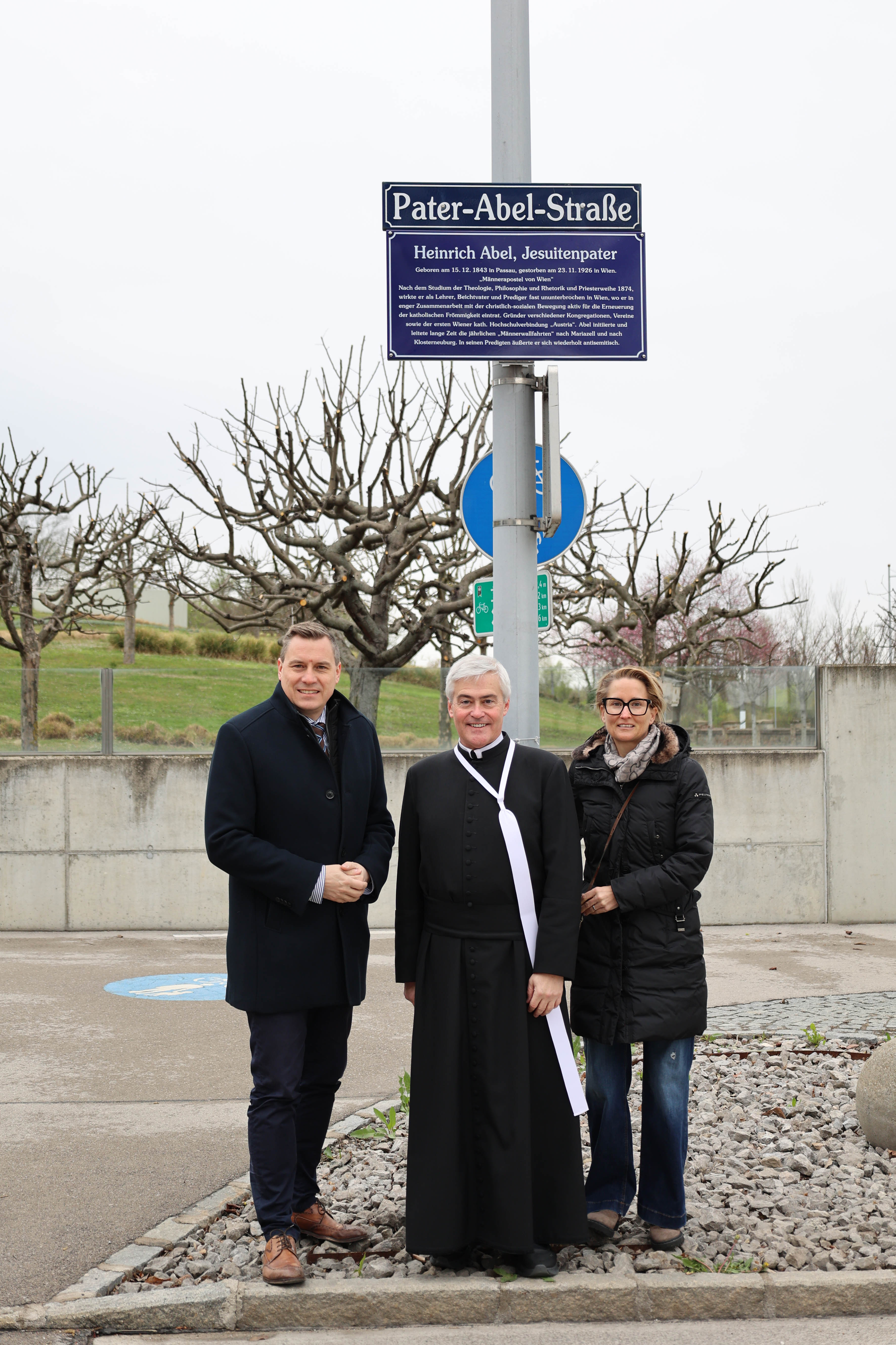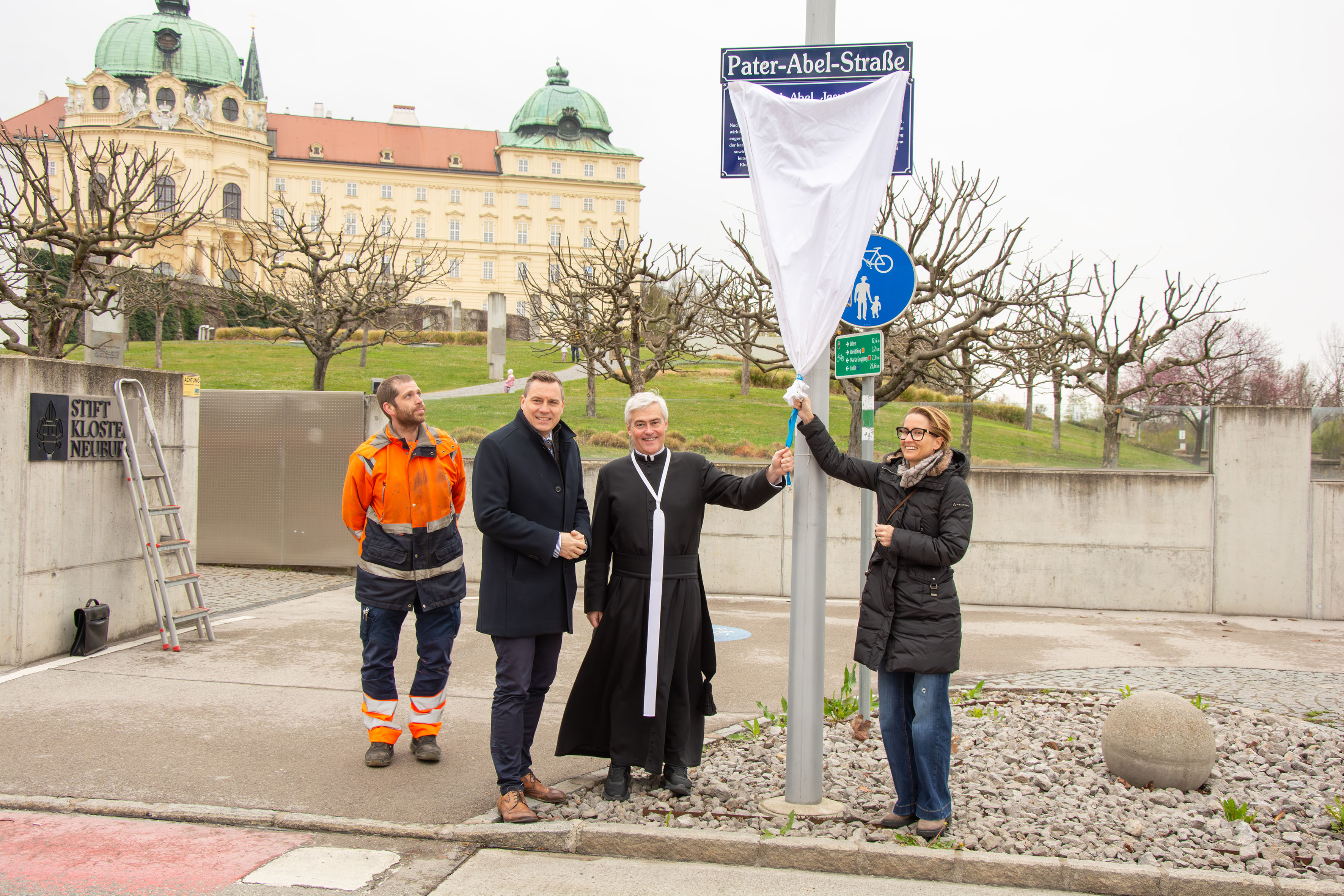 Bürgermeister Christoph Kaufmann, Stiftskämmerer Elias Can.Reg., Kulturstadträtin Katharina Danninger vor der enthüllten Zusatztafel an der Pater-Abel-Straße.(1 MB)jpg herunterladen -