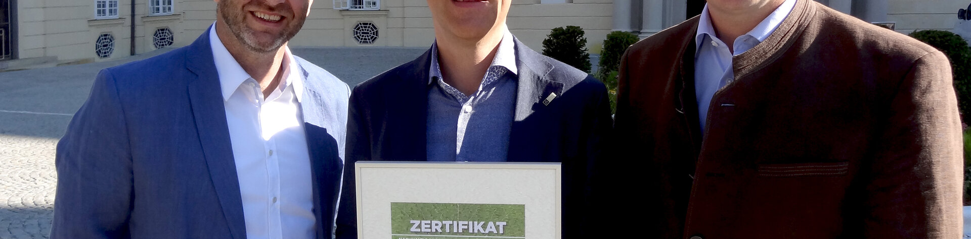 01.09.2016Das Weingut Stift Klosterneuburg wurde heute von Weinbaupräsident NR Johannes Schmuckenschlager als besonders nachhaltig arbeitender Betrieb ausgezeichnet. Das älteste Weingut Österreichs war im schonenden Umgang mit Ressourcen immer schon ein Leitbetrieb, der Zertifizierung als erstes klimaneutrales Weingut Österreichs im Jahr 2009 folgt nun die Zertifizierung im strengen Nachhaltigkeitsprogramm des Weinbauverbandes.