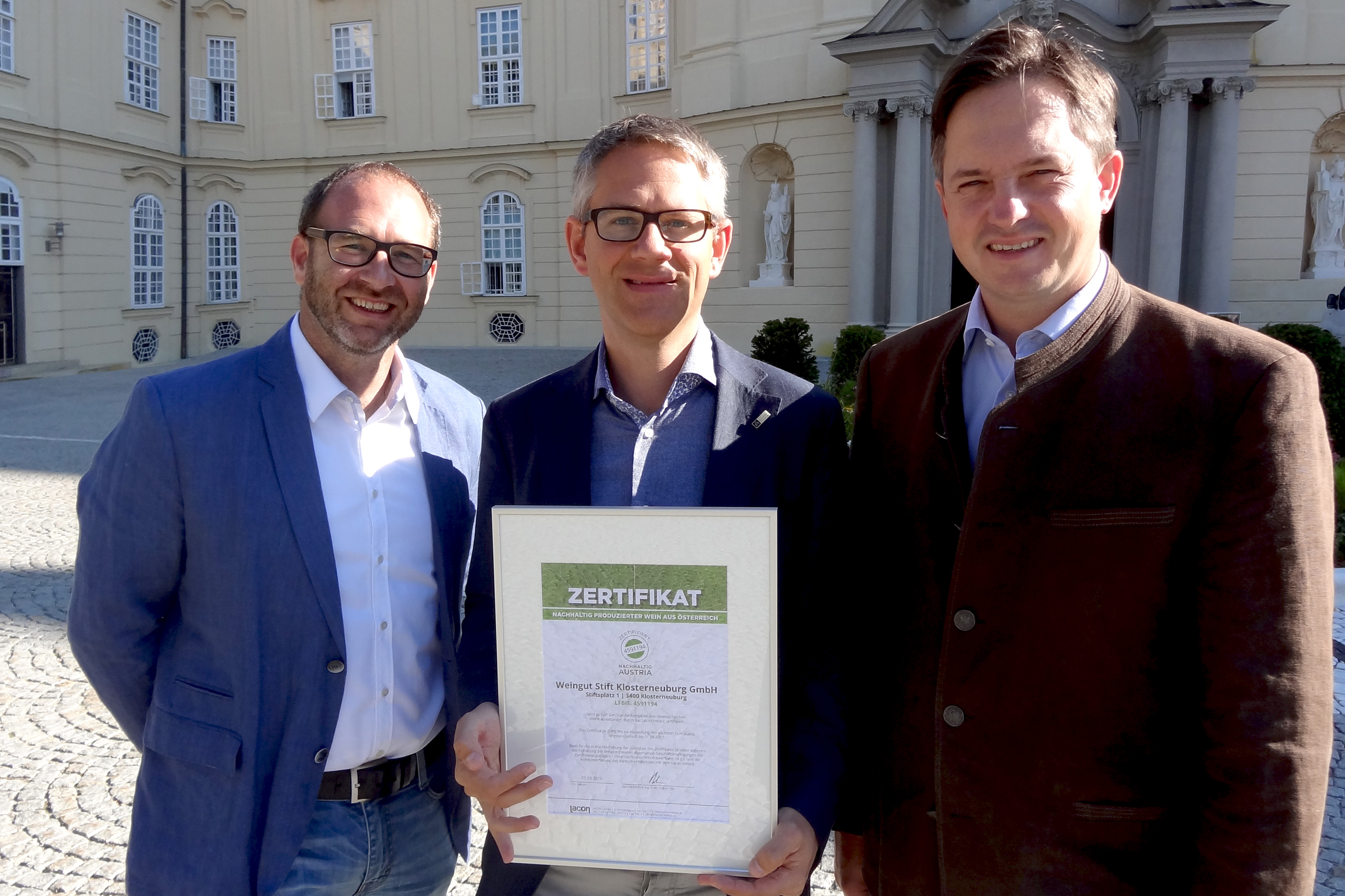 „Die Nachhaltigkeitszertifizierung dokumentiert die vielfältigen Leistungen für Umwelt und Gesellschaft der österreichischen Weinbaubetriebe. Umso wichtiger ist es, einen Leitbetrieb wie das Stift Klosterneuburg zu den Vorreitern im Bereich Nachhaltigkeit zählen zu können“, freut sich Schmuckenschlager anlässlich der Übergabe der Urkunde. Für Weingutsleiter Wolfgang Hamm ist die Zertifizierung ein sehr wesentliches Anliegen: „Große Weine können nur im Einklang mit der Natur entstehen. Die Nachhaltigkeitszertifizierung bestätigt unseren Weg in allen Bereichen so zu arbeiten, dass es allen gut geht: den Böden, Pflanzen und Lebewesen in unseren Weingärten, unseren Mitarbeitern, unseren Kunden und letztlich der Gesellschaft insgesamt!“
