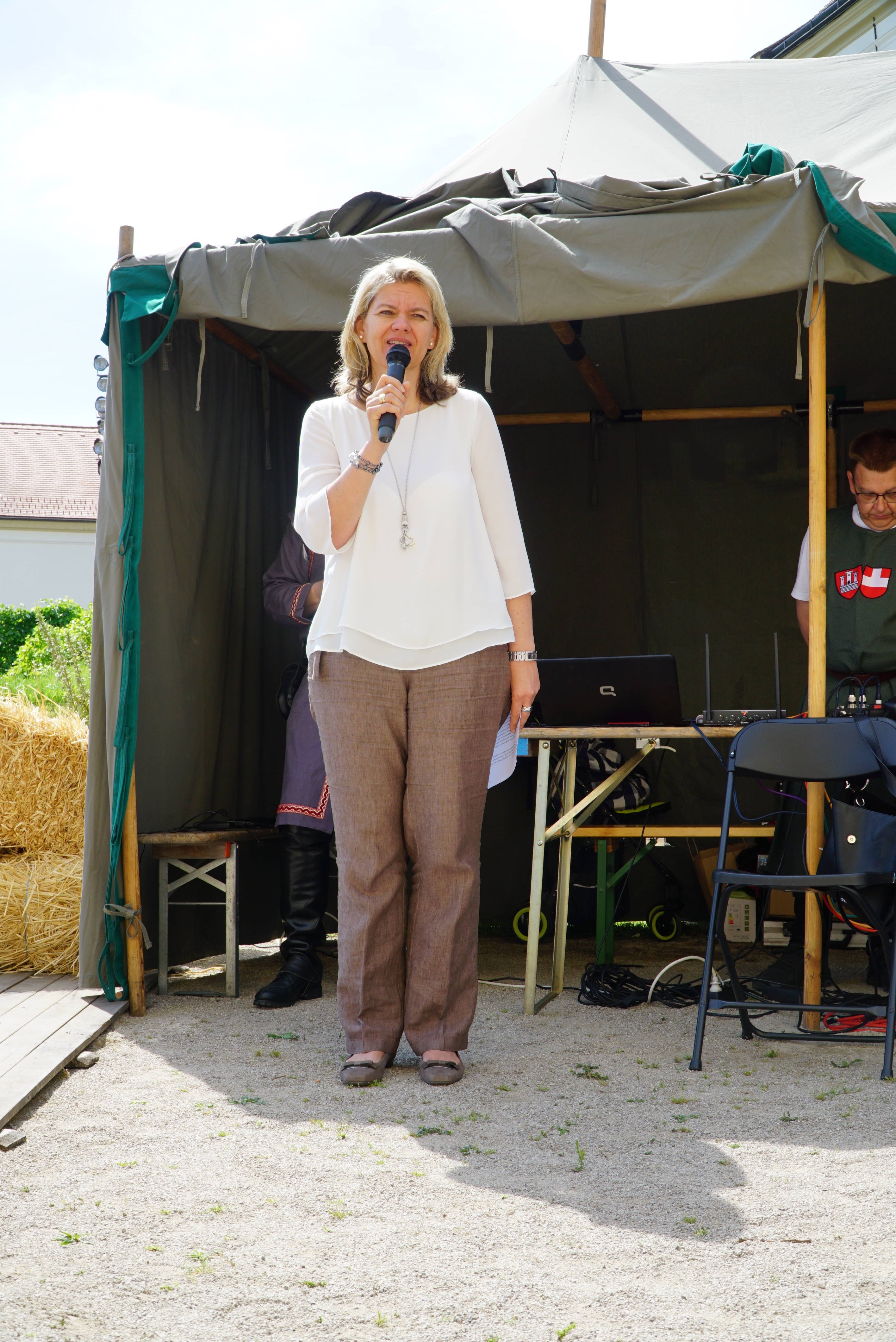 Mag. Renate Giller-Schilk, Bezirkshauptmann-Stellvertreterin, bei der Eröffnungsrede; Mag. Alexander Potucek als Herold, Gäste auf der Außentreppe Stift Klosterneuburg; Eröffnungsparade der Schausteller